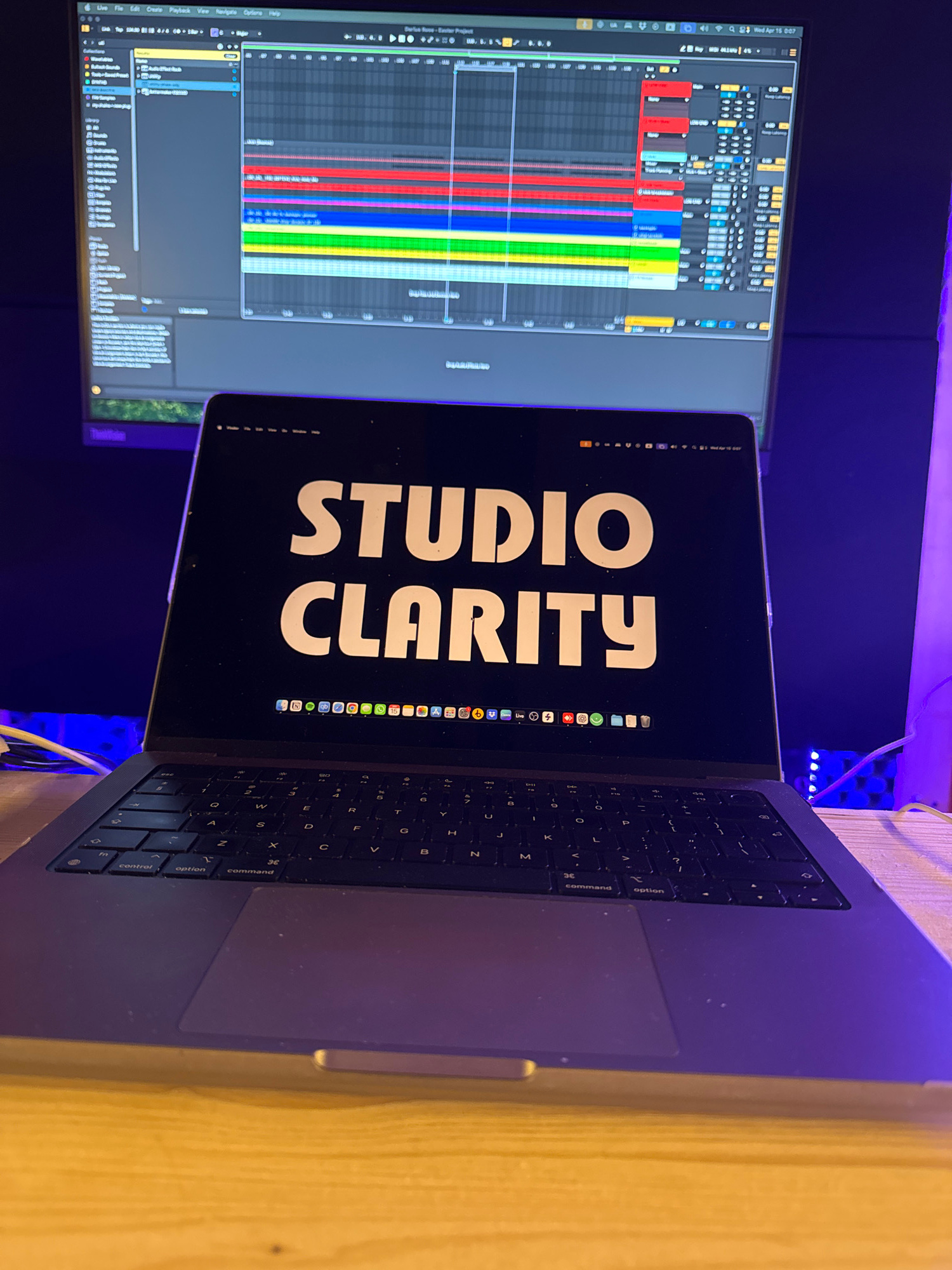 The image shows a workspace with electronic devices. In the foreground, there is a laptop, partially open, displaying the words "STUDIO CLARITY" on its screen. The laptop keyboard and trackpad are vis…read more