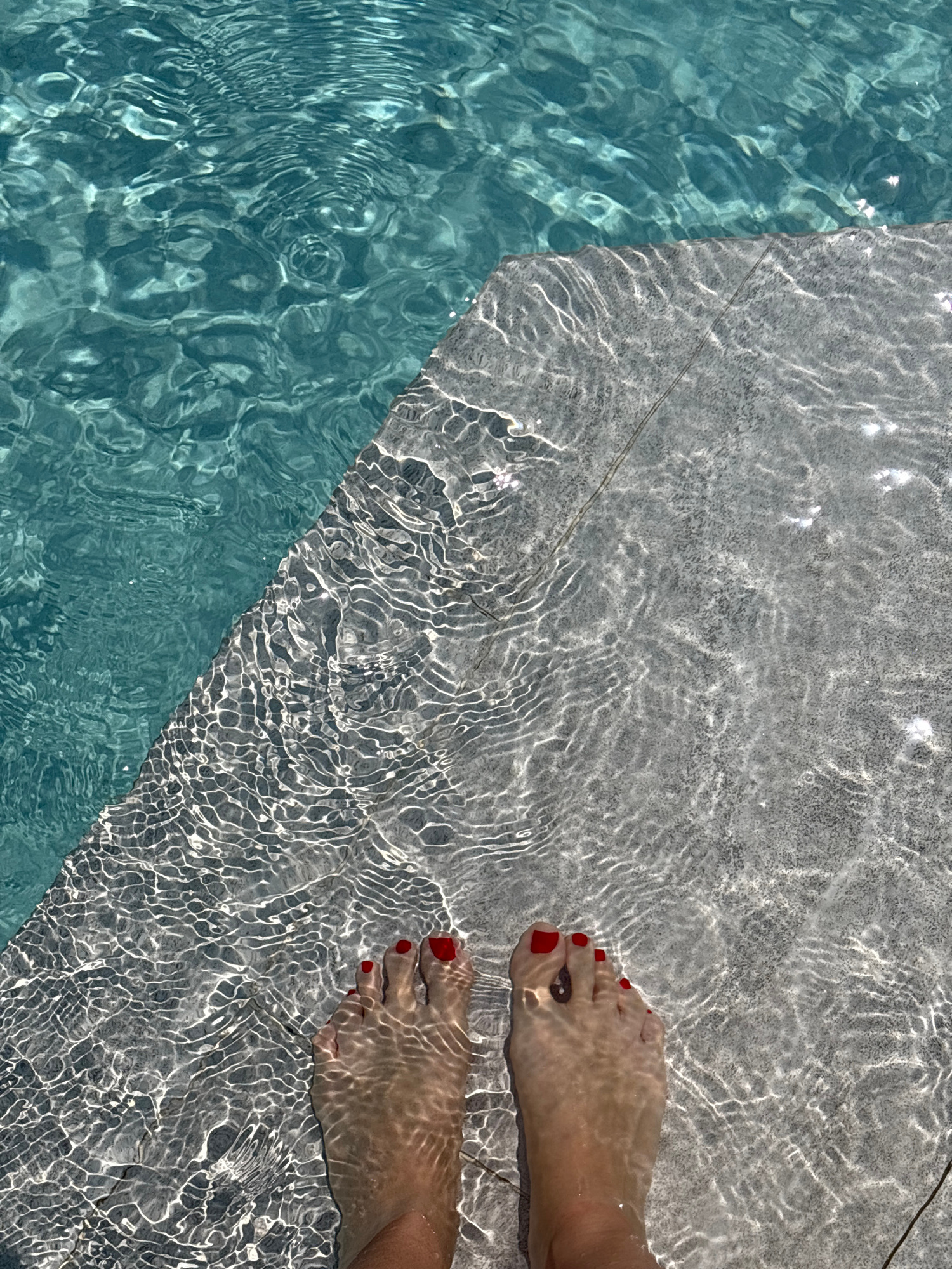 An overhead shot captures a person's feet partially submerged in clear, shallow water at the edge of what appears to be a swimming pool or a water feature. The feet, located in the upper right portion…read more
