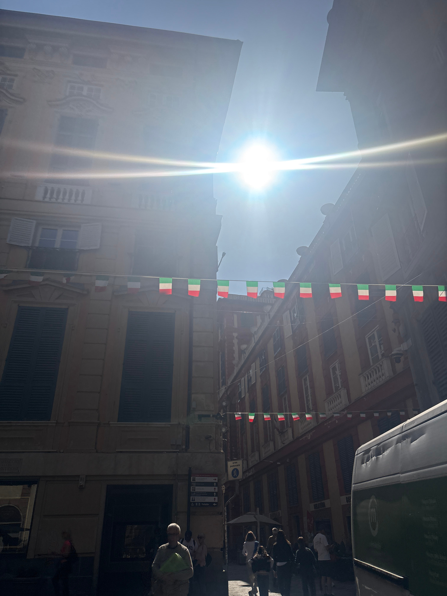 This image depicts a sunny street scene in an Italian city, likely Genoa. The photograph is taken from a low angle, looking up towards the sky and the buildings lining a narrow street. A brilliant su…read more