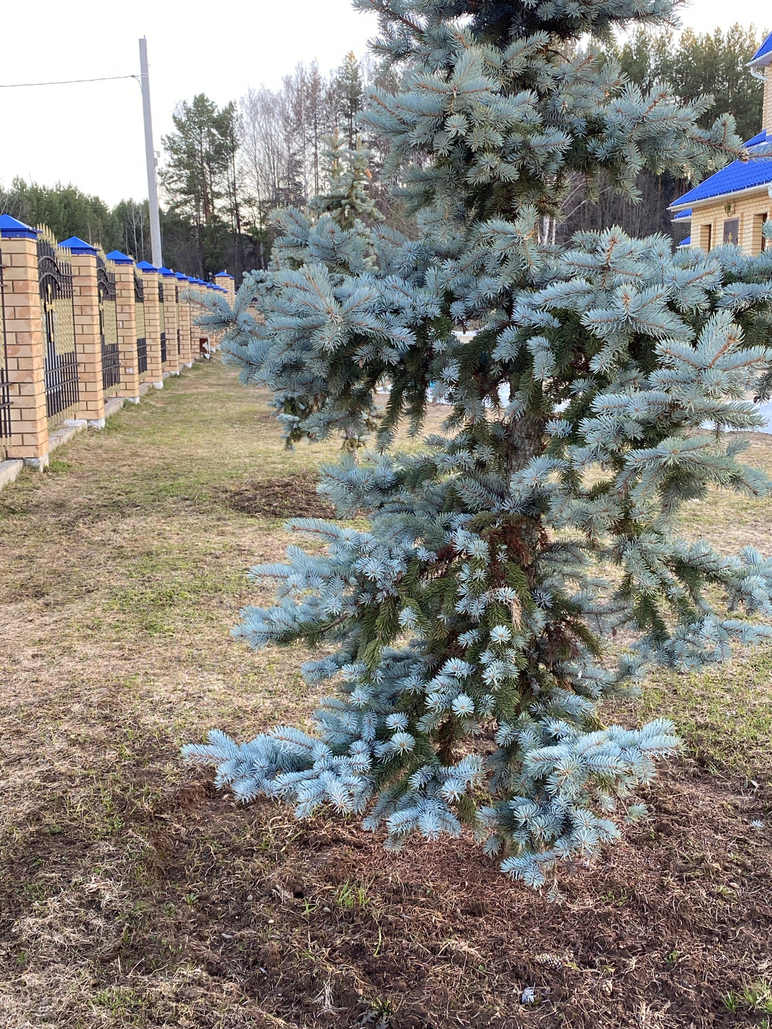 The image captures an outdoor scene dominated by a large blue spruce tree, prominently featured on the right and center of the frame. The tree displays distinctive blue-green needles. The ground surro…read more