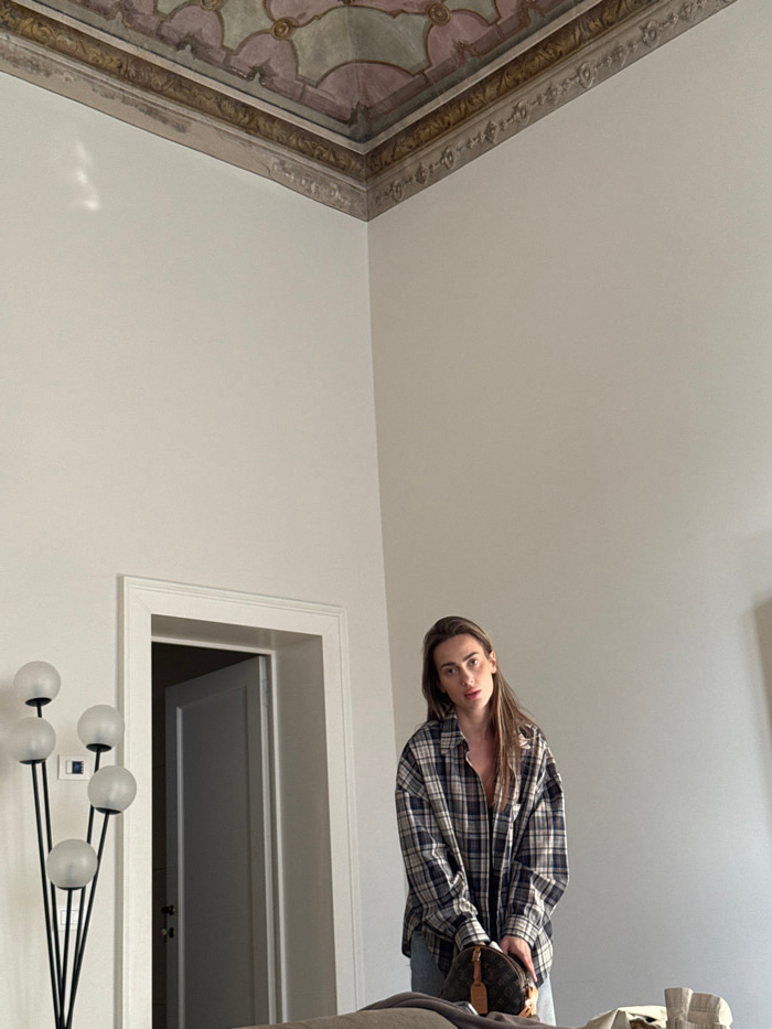 An interior photograph depicts a young adult female standing in a historic room in Venice, Italy. The female, with long brown hair featuring lighter highlights, wears a loose-fitting blue, white, and…read more