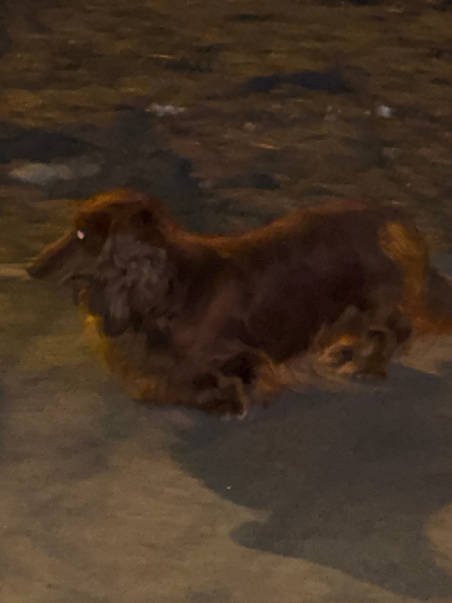 A blurry, poorly lit image shows a dead animal on a dark, possibly concrete, surface. The animal appears to be a rodent, potentially a squirrel or rat, lying on its back. Its fur is dark brown. No det…read more