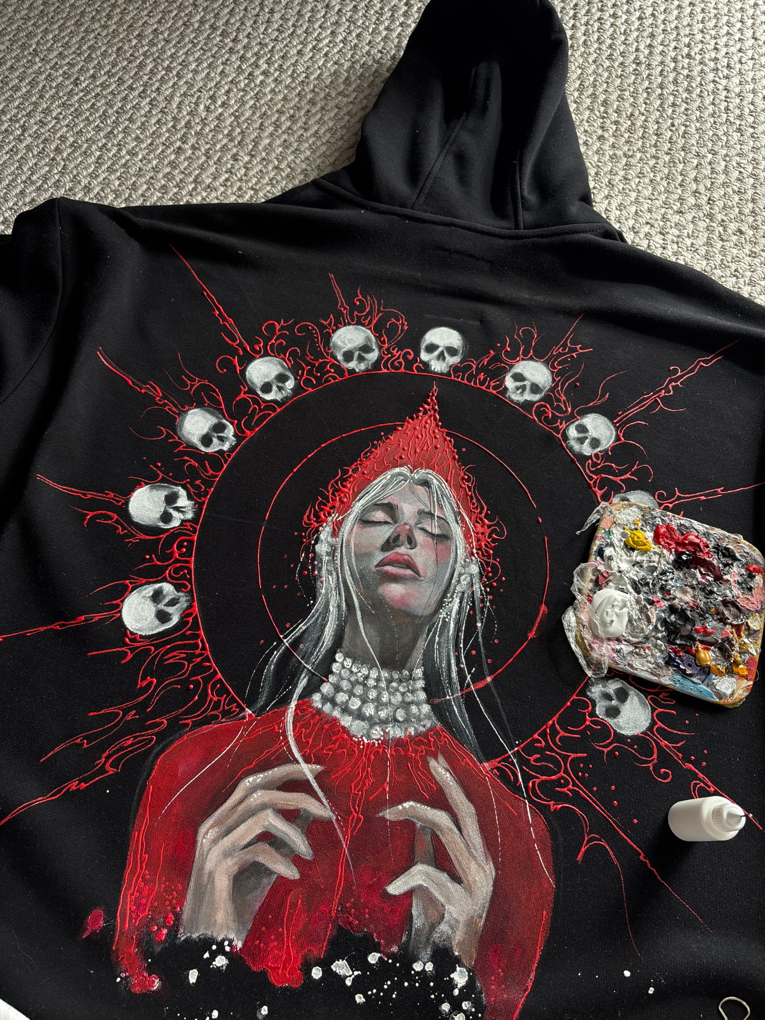 A black fabric item, likely a hoodie or sweatshirt, is laid flat on a light grey, textured carpet. The garment is adorned with an elaborate hand-painted design featuring a central, stylized female fig…read more