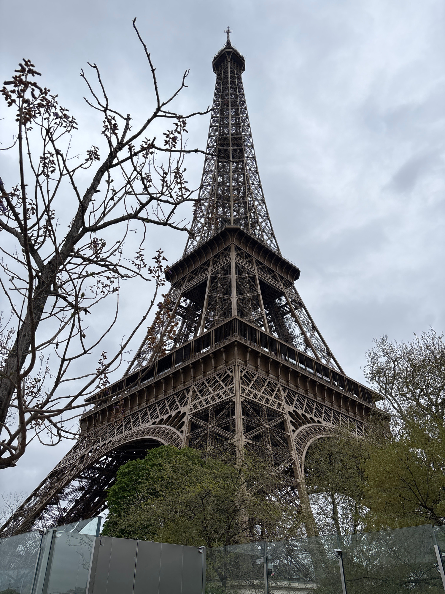 The image is a low-angle shot of the Eiffel Tower in Paris, France. The tower is constructed of metal lattice and stretches high into a cloudy sky. A bare tree branch with small buds is in the foregro…read more