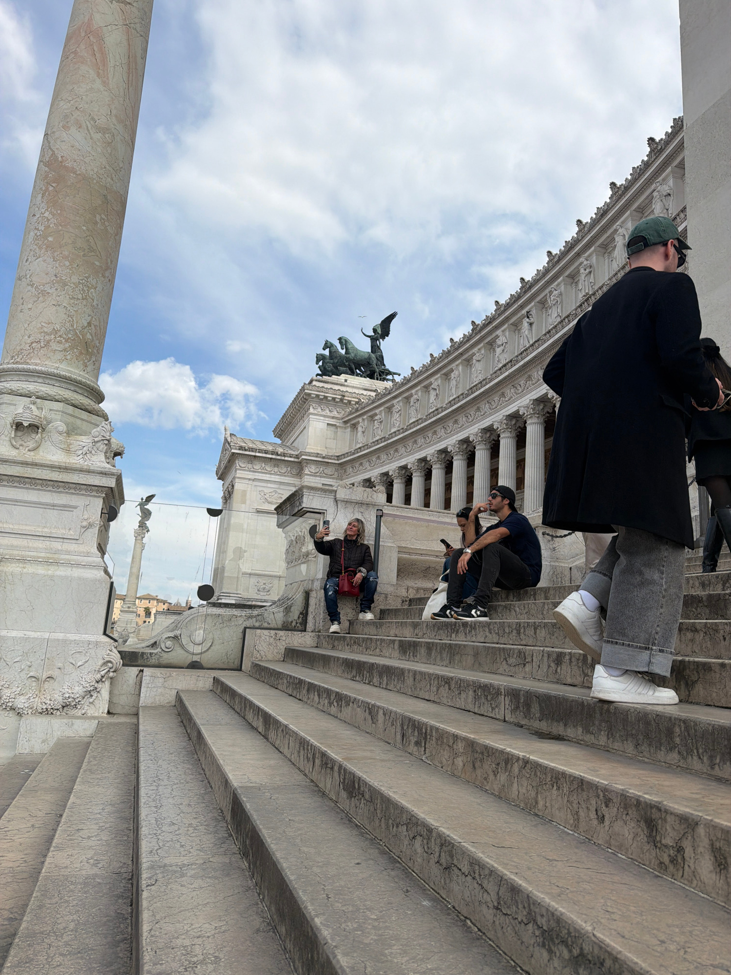 The image depicts a scene at the Altare della Patria, located in Rome, Italy. A large marble pillar is visible in the foreground. The Altare della Patria's architecture, including its decorative eleme…read more