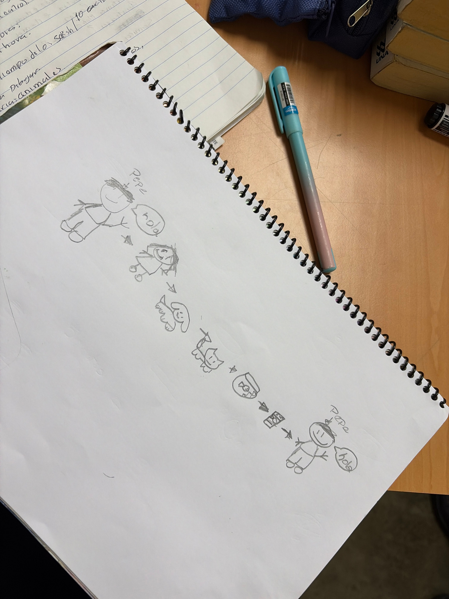 The image shows a handwritten sketch on a spiral-bound notebook resting on a desk. The sketch depicts a sequence of interactions, starting with a stick figure labeled "Pepe" saying "hola" (Spanish for…read more