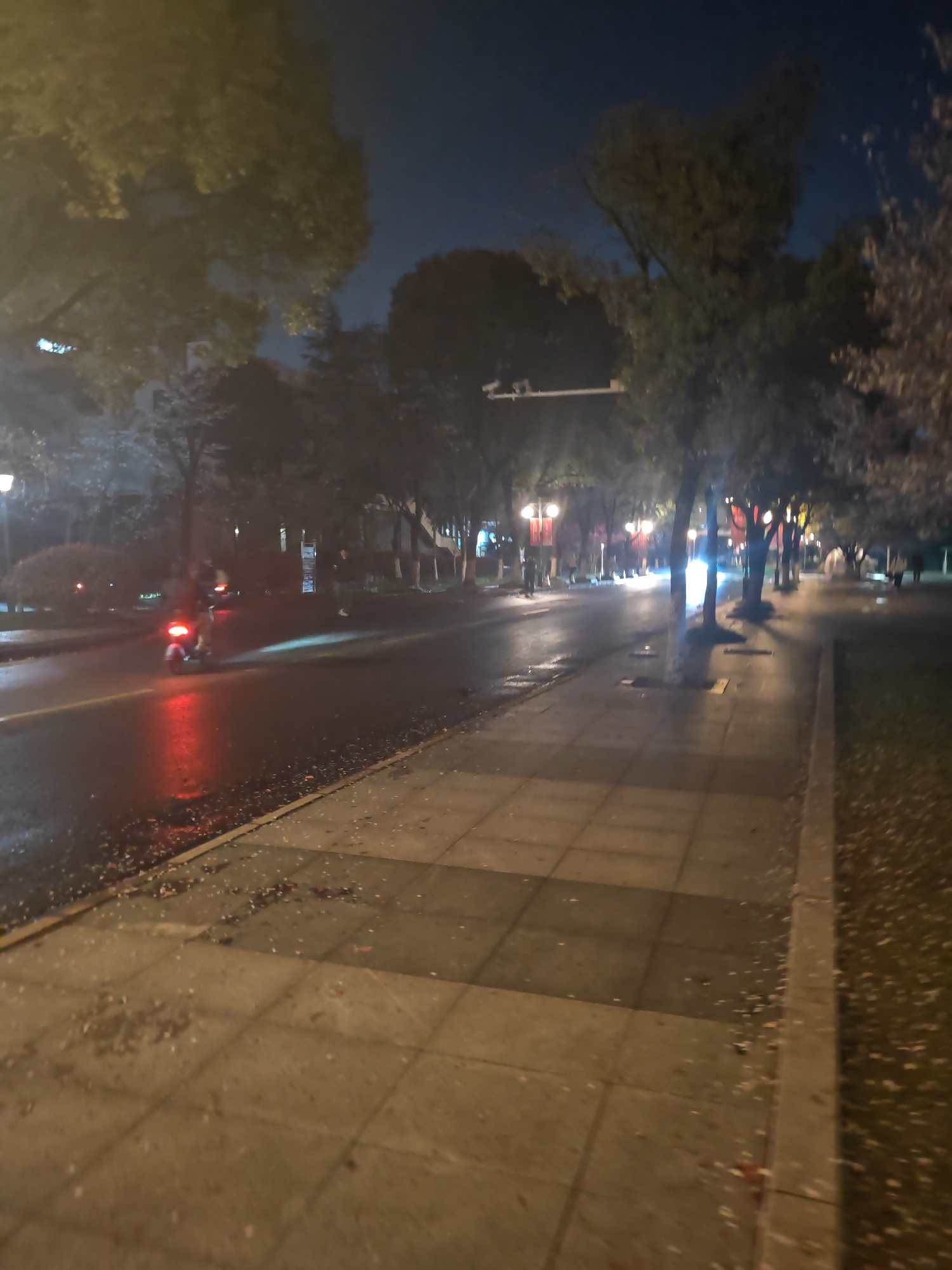 The image depicts a nighttime street scene in Jiangning District, China. A wet road reflects red taillights of a scooter moving along the road. A sidewalk runs along the right side of the street, markβ¦read more