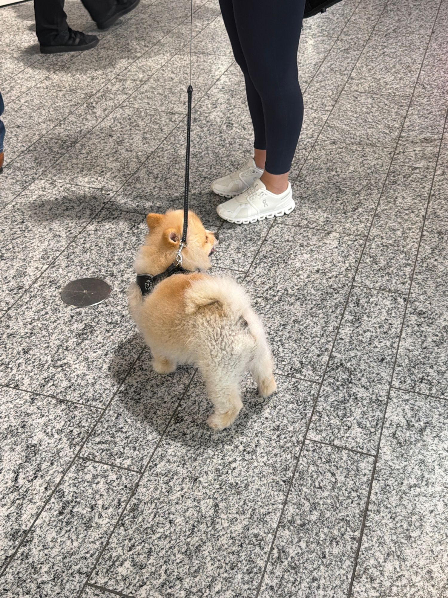 A high-angle shot depicts a small, tan Pomeranian dog laying on a grey tile floor. The dog is wearing a black harness and is attached to a black leash. A person wearing black leggings and white sneake…read more