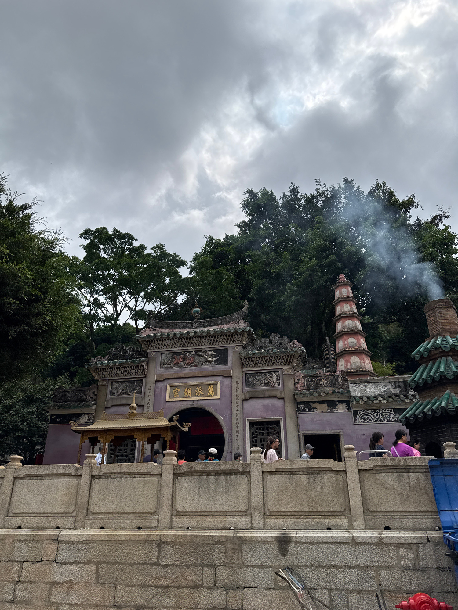 Here is a description of the image: The image features a view of the A-Ma Temple, a famous temple in Macau, China. The angle of the shot is rotated counterclockwise. The temple complex is ornately d…read more