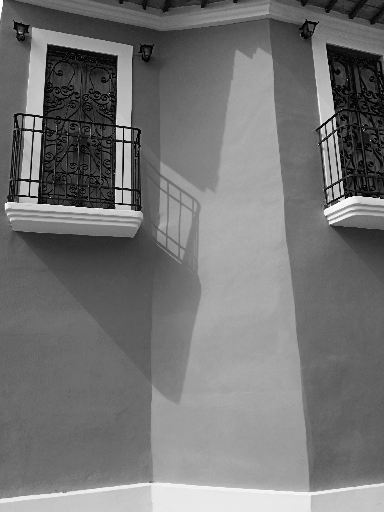 Black and white photograph showing two ornate wrought iron balconies on a building in Montalbán, Venezuela. The building's exterior wall is a uniform gray tone. The balconies have white trim. The ligh…read more