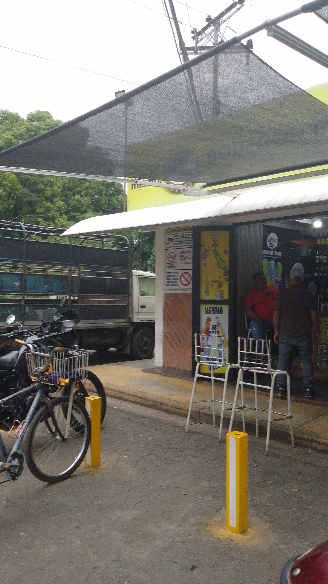 The image depicts a street scene in Tinaquillo, Venezuela. A white delivery truck with a metal cage back is parked on the street next to a storefront. A motorcycle and bicycle are parked in front of…read more