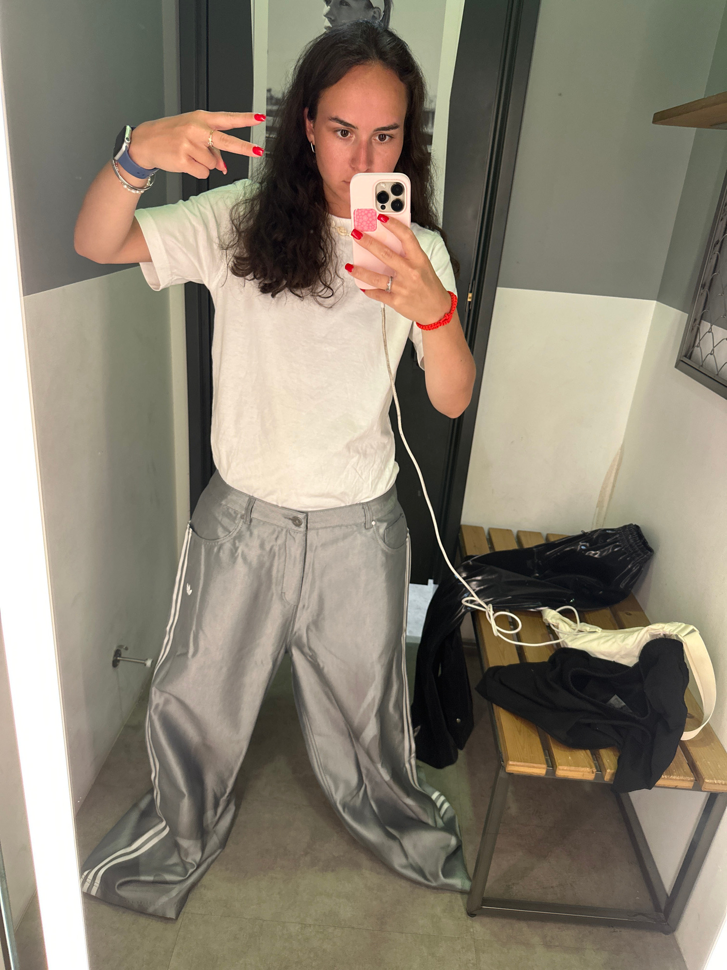 A young woman is taking a mirror selfie in a dressing room. She is wearing a white t-shirt and gray Adidas track pants. She has dark hair and is holding a pink phone. Her fingernails are painted red.…read more