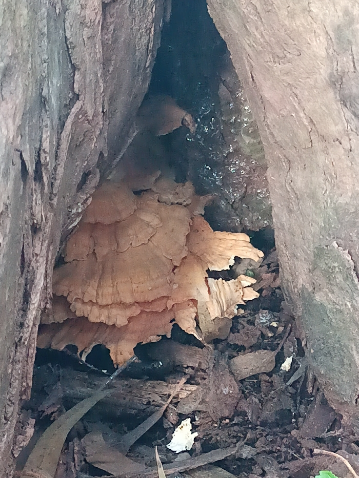 A cluster of shelf fungus grows within a tree's crevice. The layered, fan-like structures have a pale, peach-colored hue. The tree bark is rough and furrowed, forming the walls of the narrow space. Leβ¦read more