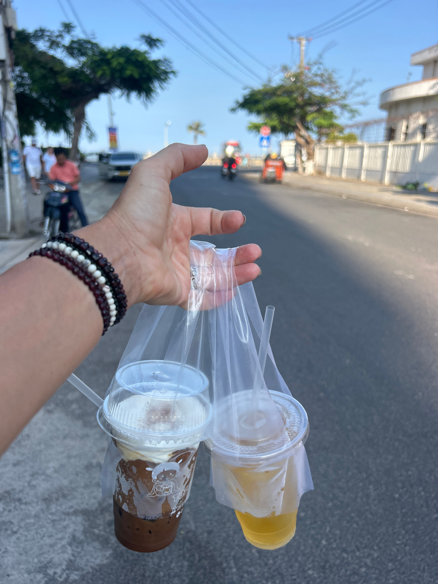 A first-person perspective photograph captures a person's hand holding two takeaway drinks in a clear plastic carrier bag, set against a bustling outdoor street scene. The hand, adorned with multiple…read more