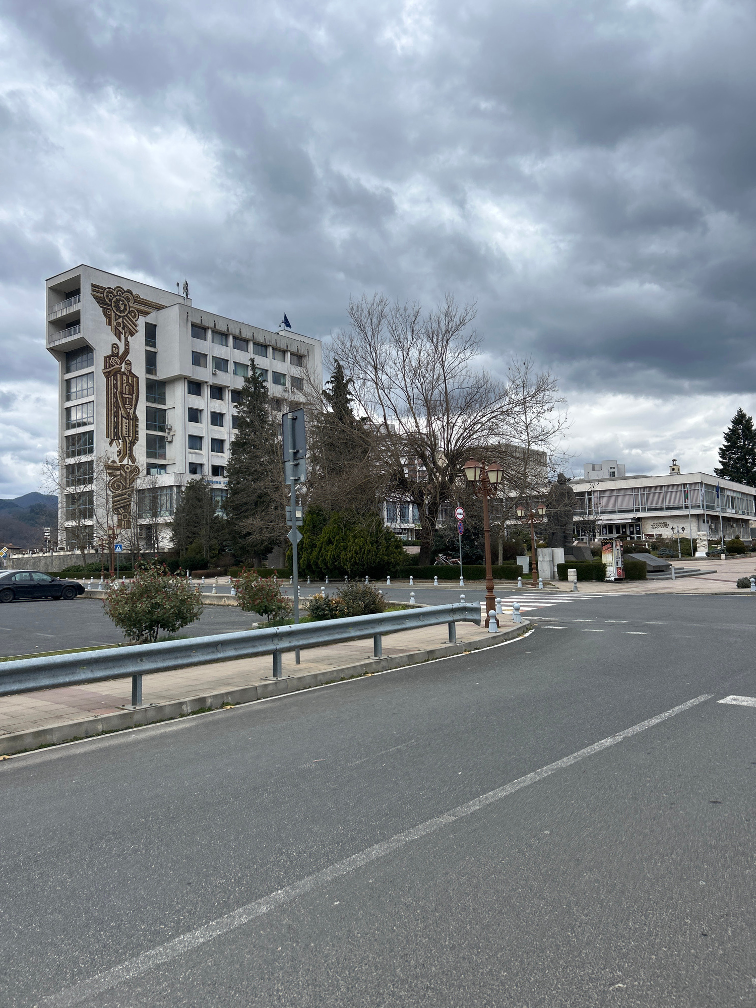The image shows a view of a street in Zlatograd, Bulgaria. A multi-story white building with a distinctive mosaic-like artwork on its facade is visible on the left side of the frame. A leafless tree s…read more