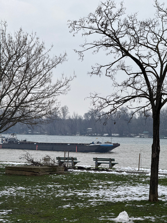 The image depicts a winter scene along the bank of the Danube River in Belgrade, Serbia, under an overcast grey sky. In the foreground, patches of melting snow are interspersed with green grass on a…read more