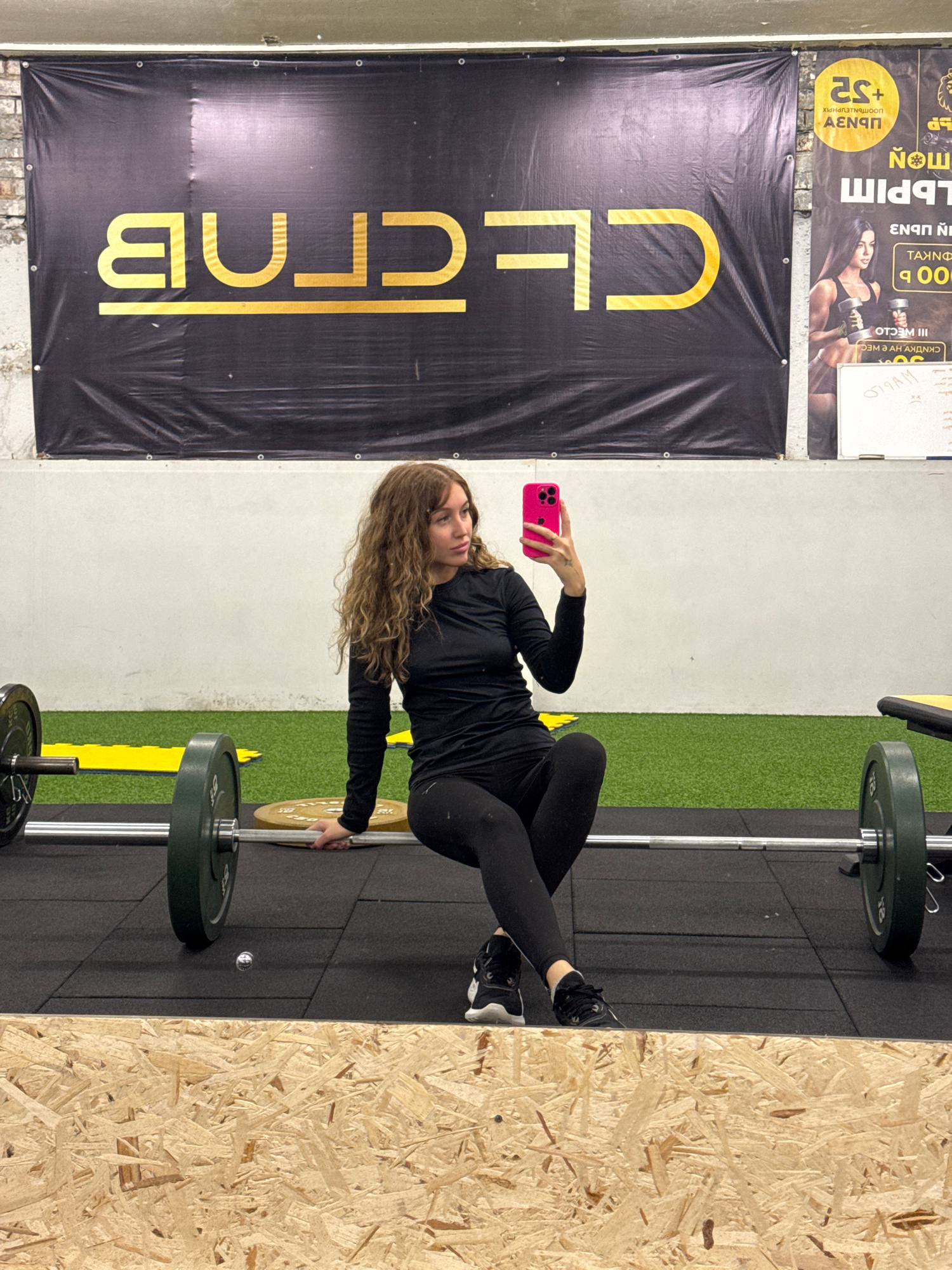 Here is a concise description of the image: The image appears to be taken in a fitness center, possibly the "CF Club" based on the prominent banner in the background. A woman is positioned in the cen…read more