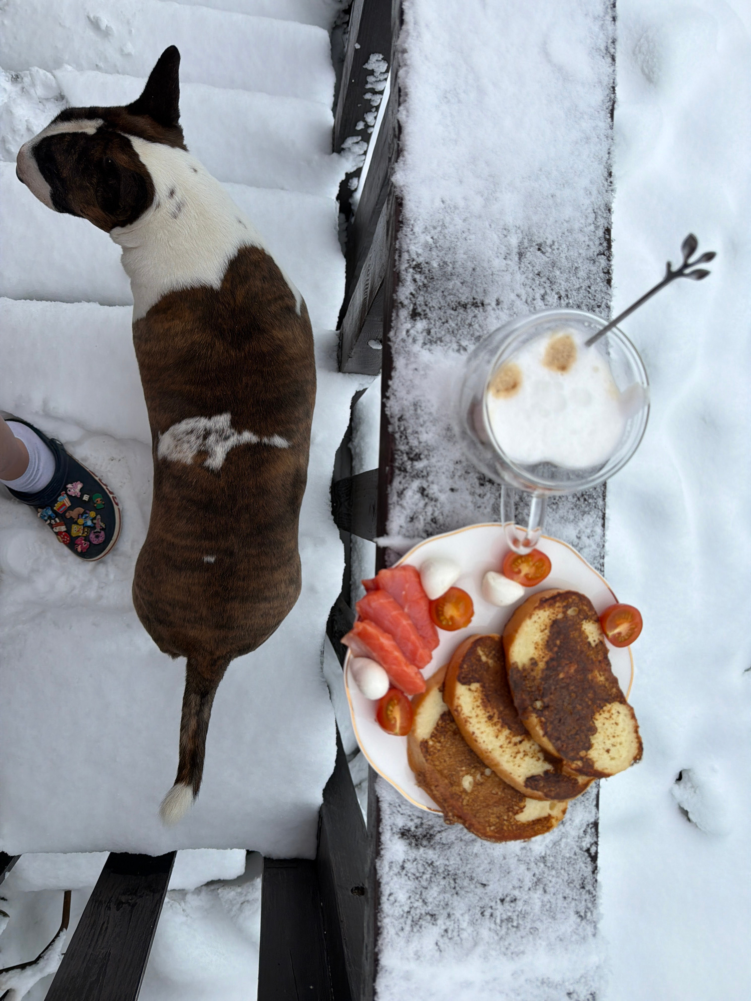 An eye-level, high-angle shot shows a snow-covered outdoor scene. On snow-dusted dark brown wood planks sits a clear mug containing a latte with a swizzle stick, and a white plate with gold trim holdi…read more