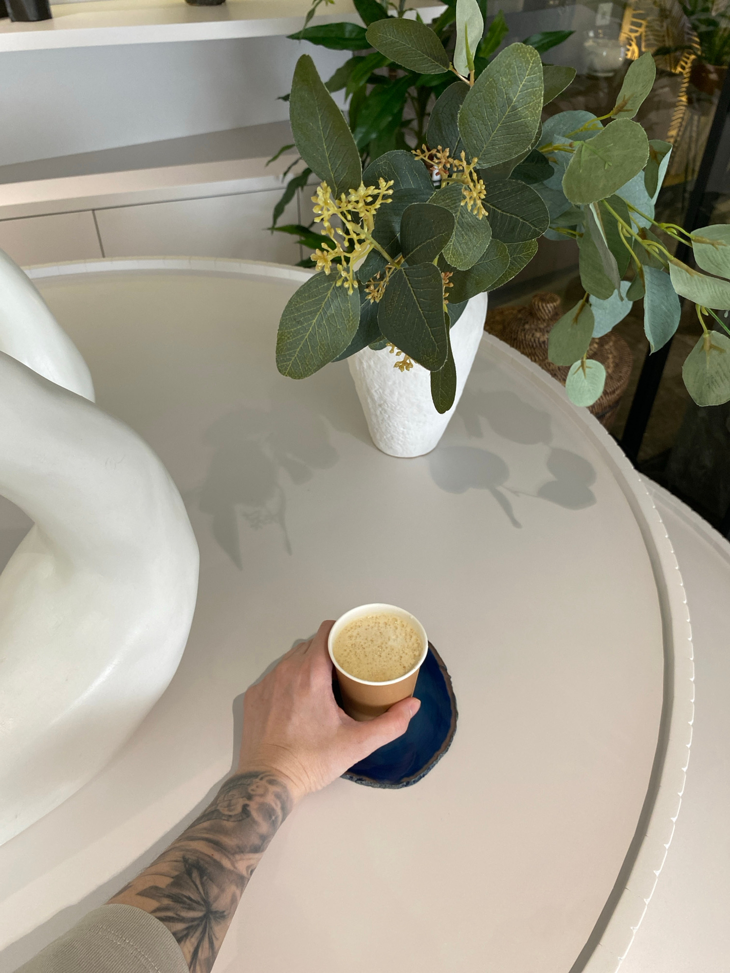 A high-angle shot shows a hand holding a brown paper cup filled with a beige liquid, seemingly coffee, near a circular blue hole in a smooth, cream-colored surface. The hand, with a tattoo covering mo…read more