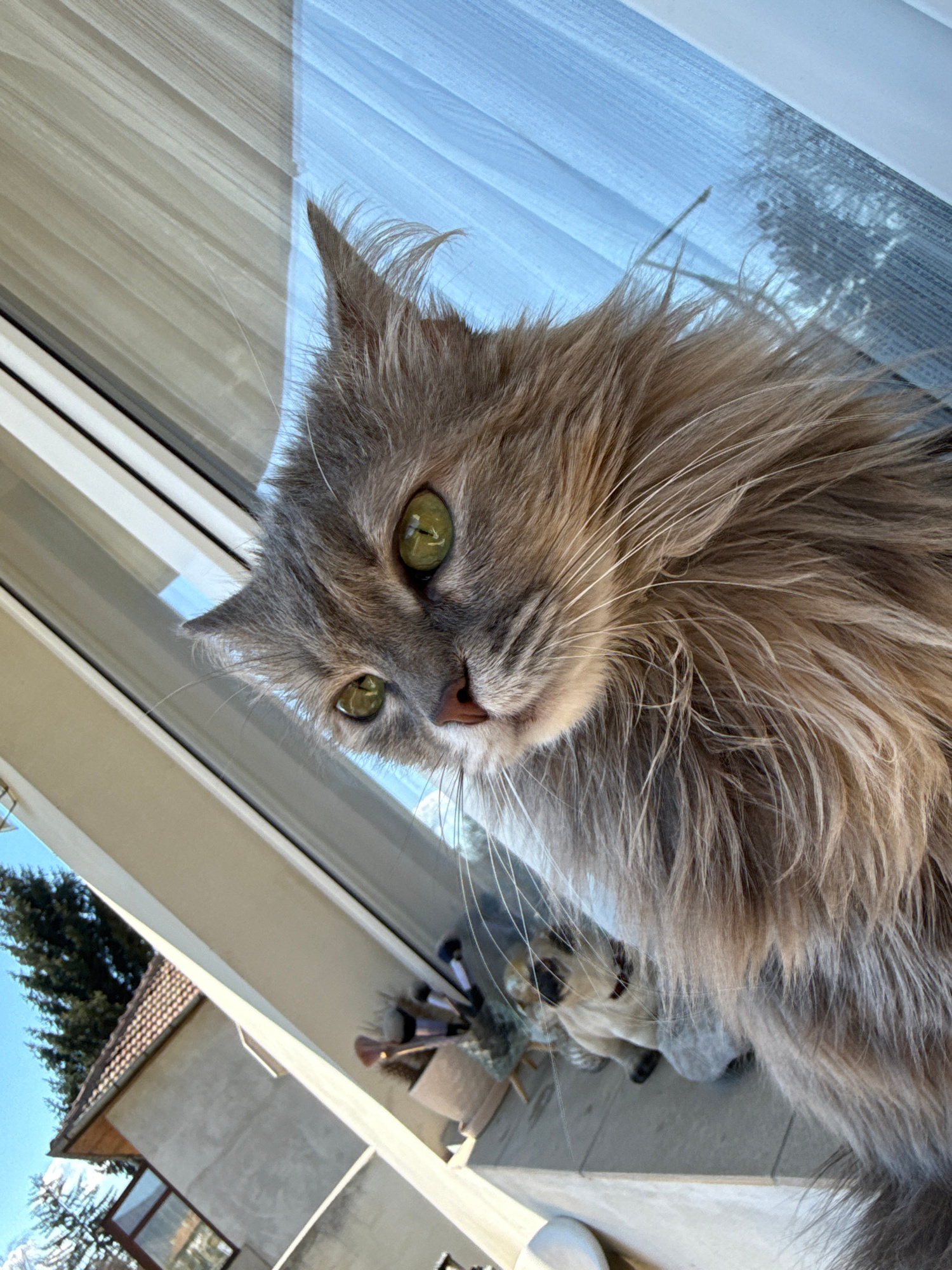 A medium shot depicts a grey, fluffy cat with green eyes, positioned upside down. The cat is partially resting on a light-colored window frame with vertical blinds. Outside the window, a building with…read more