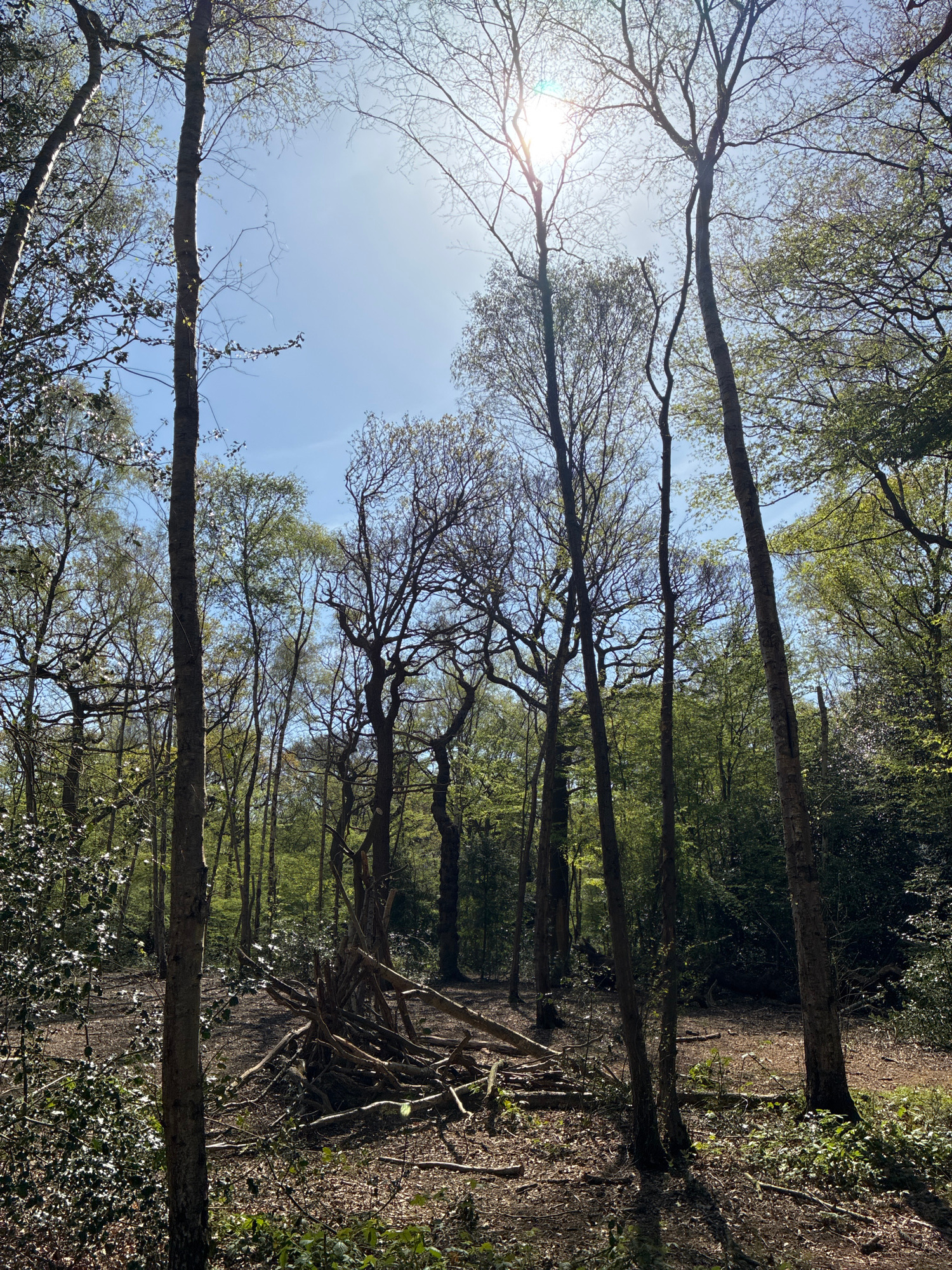 The image presents a view looking upwards through a forest canopy. Sunlight filters through the branches against a blue sky. The trees appear to be located in a wooded area with leaf-covered ground. T…read more