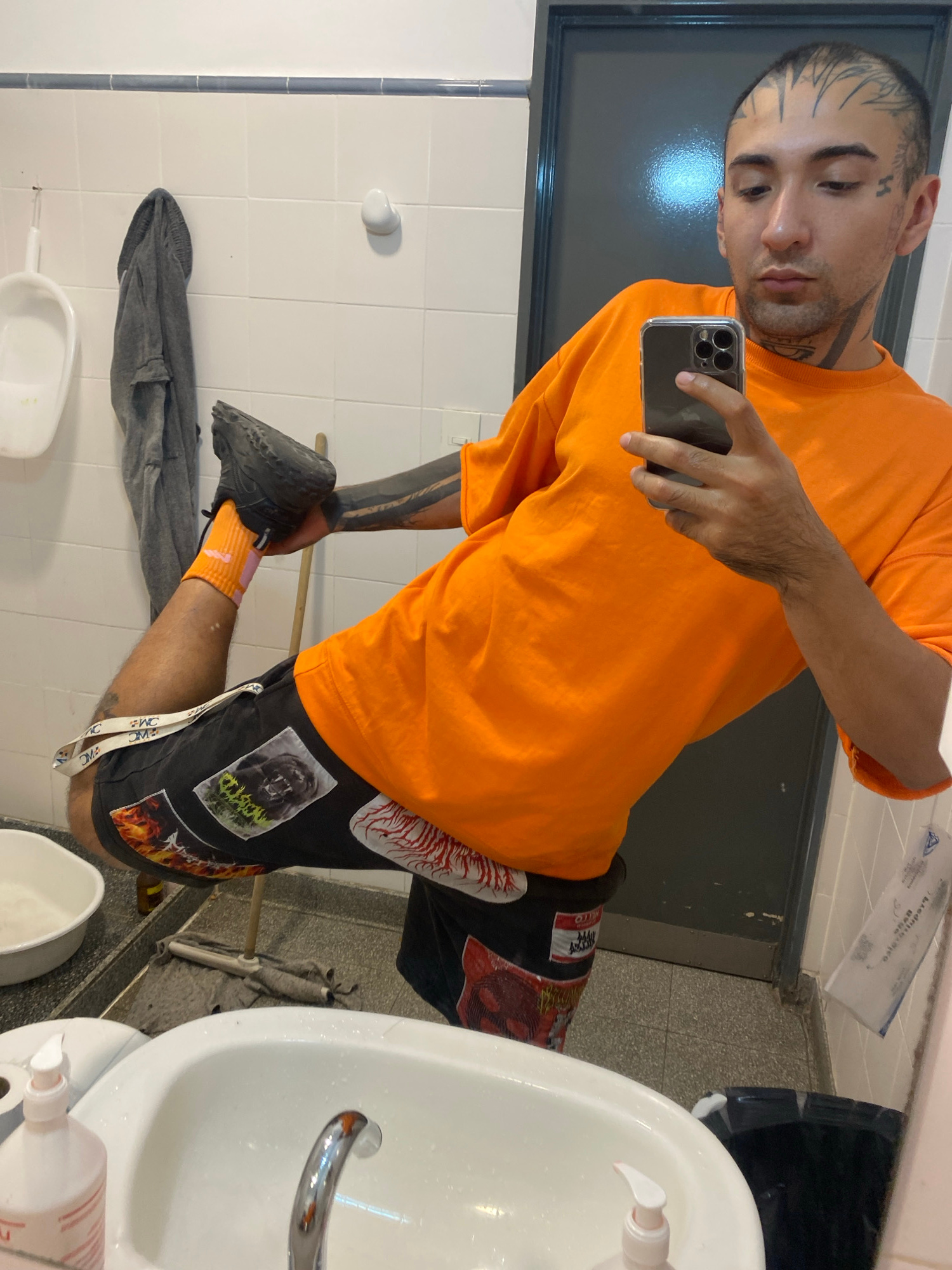 A person with tattoos on their face, neck, and arms is taking a selfie in a bathroom. They are wearing an orange t-shirt, black shorts with patches, and orange socks with grey sneakers. The bathroom h…read more