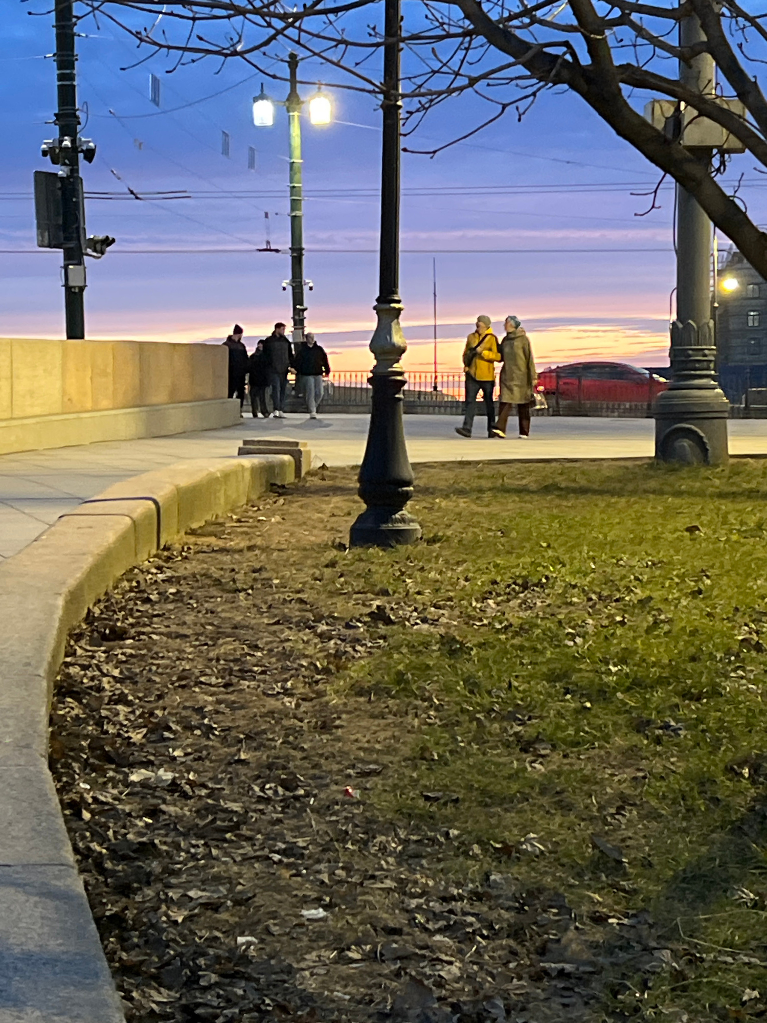 Here is a forensic description of the image: **Location:** Embankment, Saint Petersburg, Russia, evidenced by architectural details and sky coloration characteristic of the city. **Subjects:** * S…read more