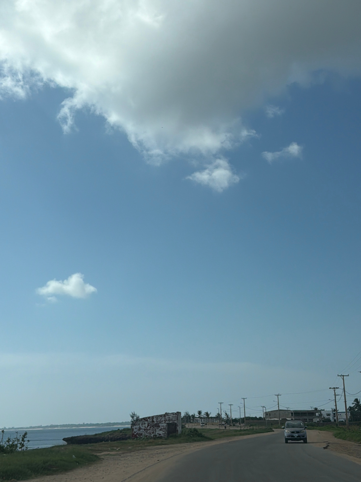 A road scene in Pemba, Mozambique. A car travels on the asphalt road. Utility poles line the roadside. A dilapidated, graffiti-covered structure stands near the road. The sky is blue with scattered cl…read more