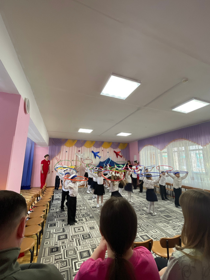 Children in matching white shirts and dark skirts or pants stand in rows on a patterned floor, holding colorful hoops. A woman in a red dress stands near chairs lined up for an audience. A stage backd…read more