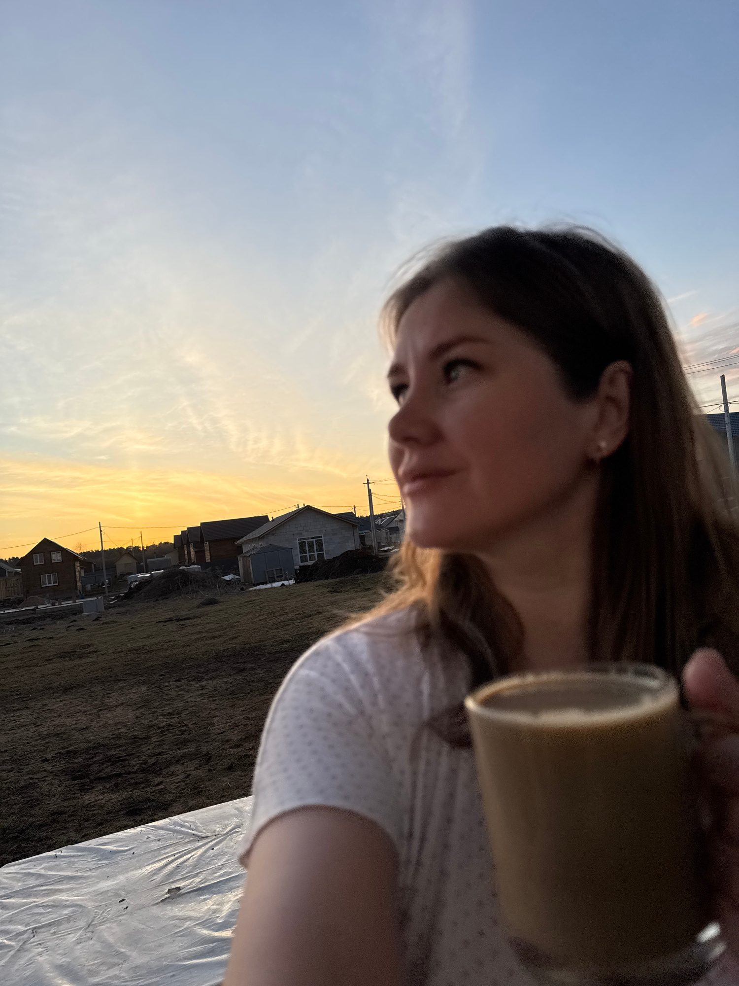 A woman with light brown hair, wearing a light-colored, polka-dotted top, is holding a brown mug. The background shows a sunset and a street of houses, possibly in Gornyi (Dvurechenskoe S/P), Russia,…read more