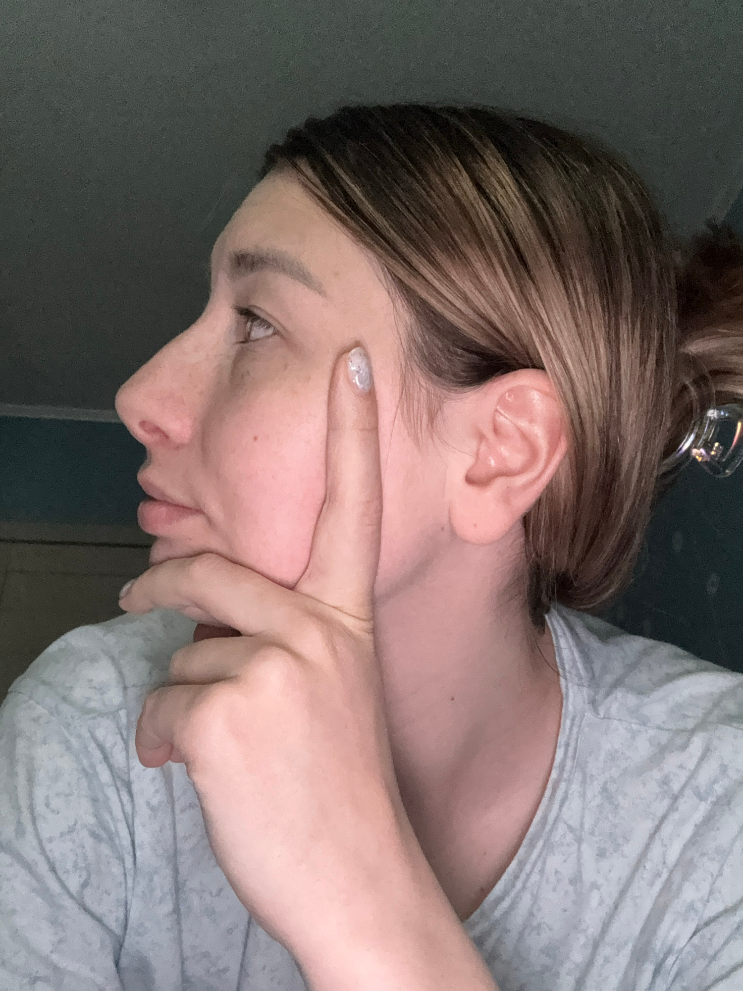 A woman with light skin and brown hair pulled into a bun is shown from the side. She's wearing a light gray patterned shirt. Her right index finger is pointing towards her eye, and her other fingers a…read more