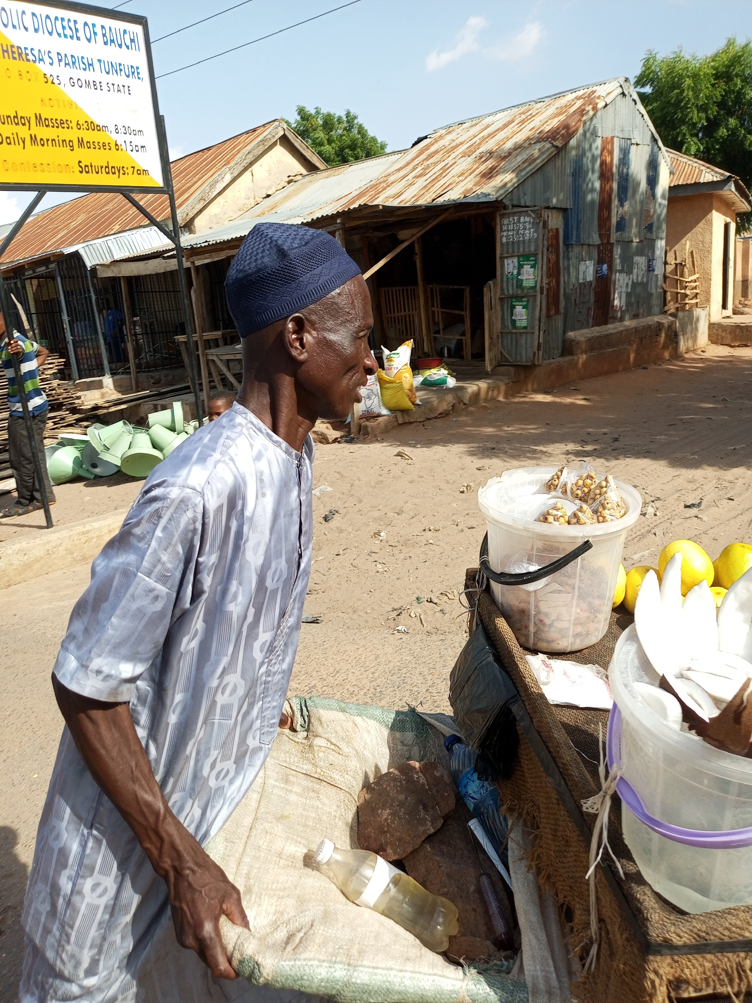 An outdoor scene depicts a street vendor in what appears to be a rural area. An elderly man, wearing a blue knit cap and a light-colored, patterned traditional garment, is standing near a cart loaded…read more