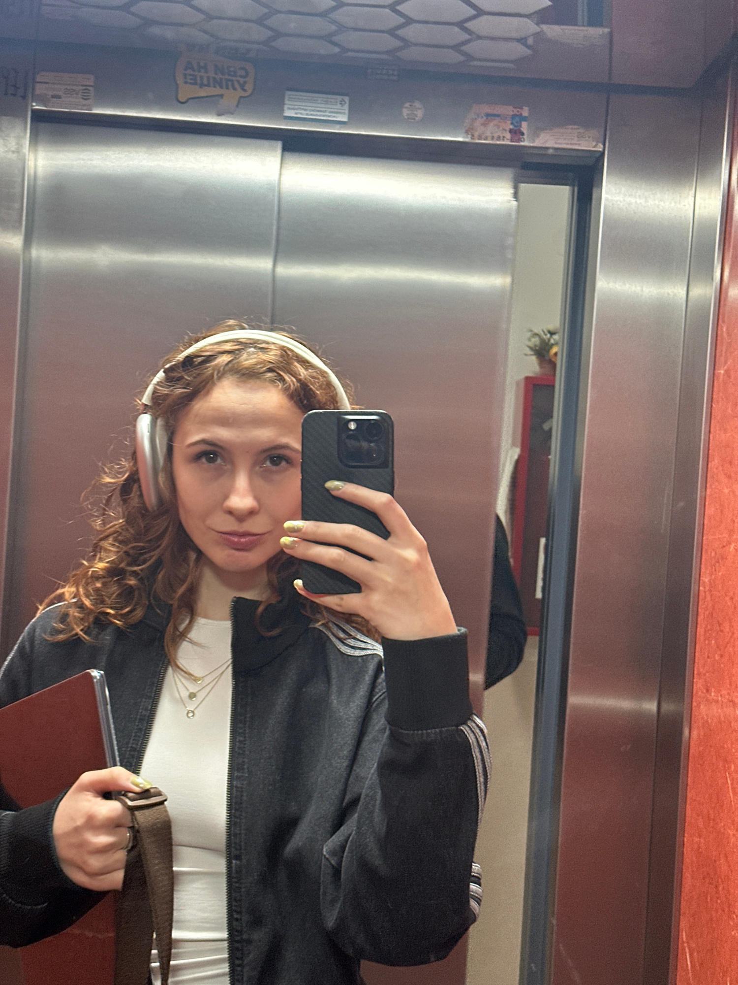 A young woman is depicted taking a mirror selfie inside an elevator in Novi Sad, Serbia. She has long, curly brown hair and a fair complexion, looking directly at the camera with a subtle, pleasant sm…read more