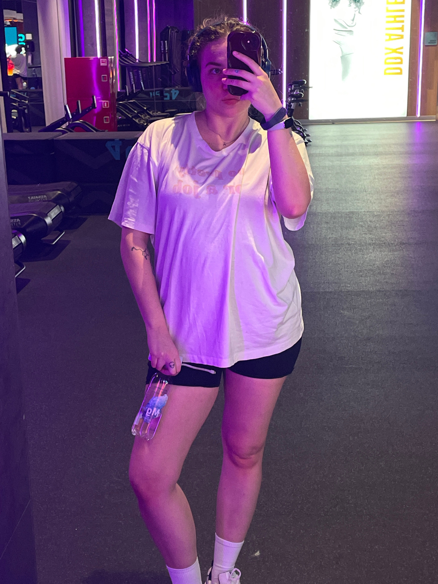 A young woman is taking a selfie in what appears to be a gym or fitness center. She is wearing a white t-shirt, black shorts, white socks, and sneakers. She is holding a water bottle in one hand and a…read more