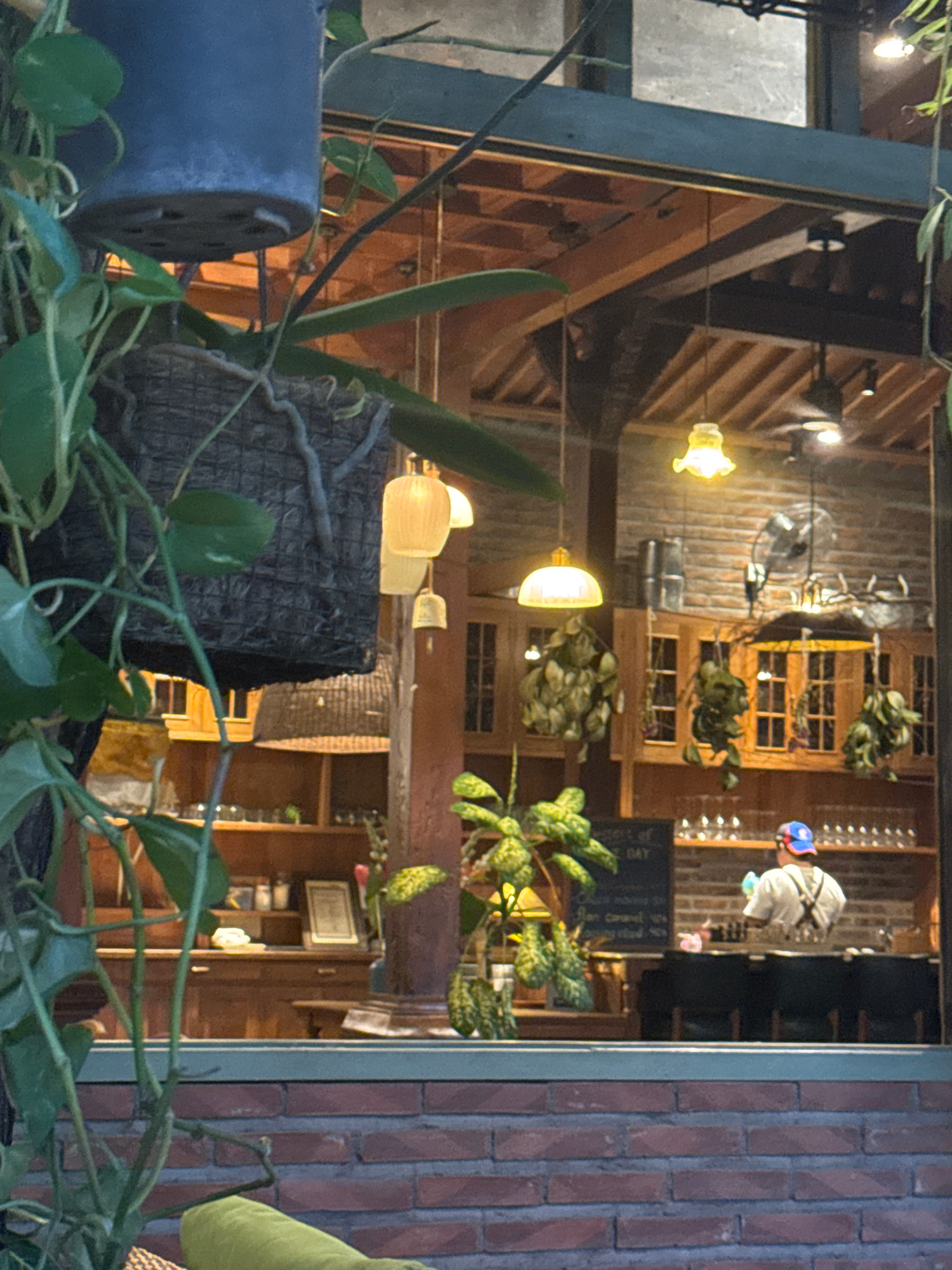 Captured from what appears to be a window perspective, the image reveals an interior space filled with warm lighting and a rustic aesthetic. Plants in pots are prominent in the foreground, blurring so…read more