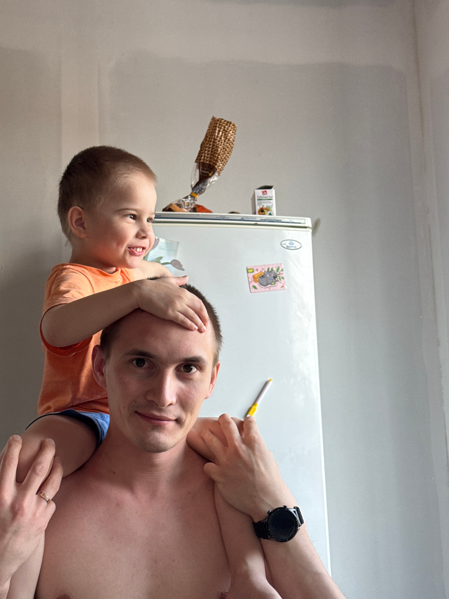 The original image, presented sideways, captures a joyful indoor scene, likely in a casual home in Chaikovsky, Russia, featuring a man and a young child. The man, possibly the father, is seen shirtles…read more