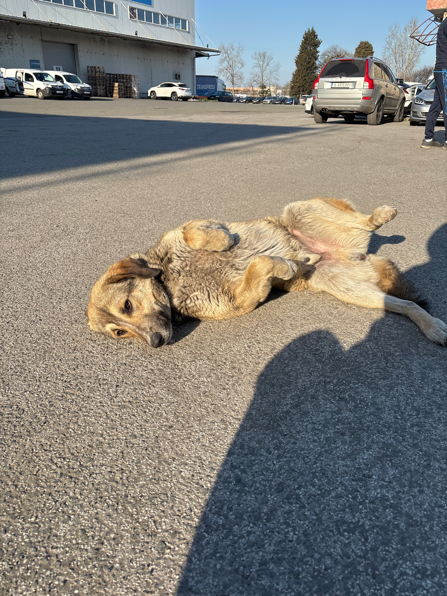A medium-sized, light brown dog is lying on its back on an asphalt surface in an outdoor environment, possibly a parking lot or street area. The dog's belly is exposed, and its paws are curled up towa…read more