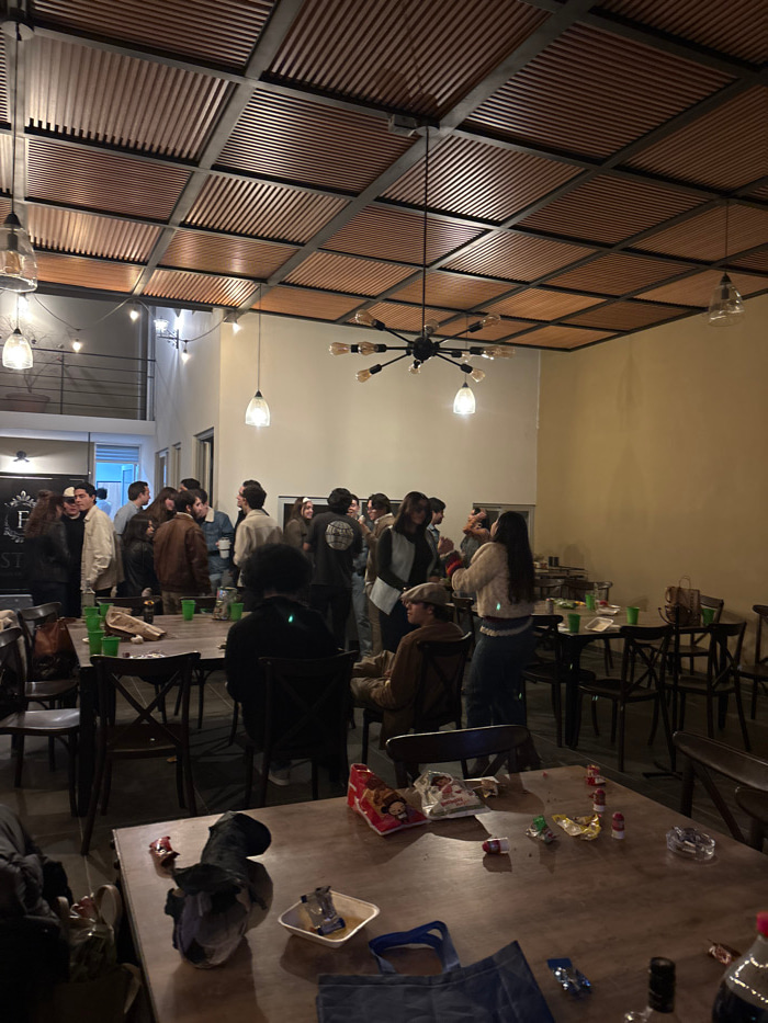 A long table occupies a room, littered with food wrappers and discarded items. People sit along the table, engrossed in an activity. One side of the room features a wall covered in a grid pattern of w…read more