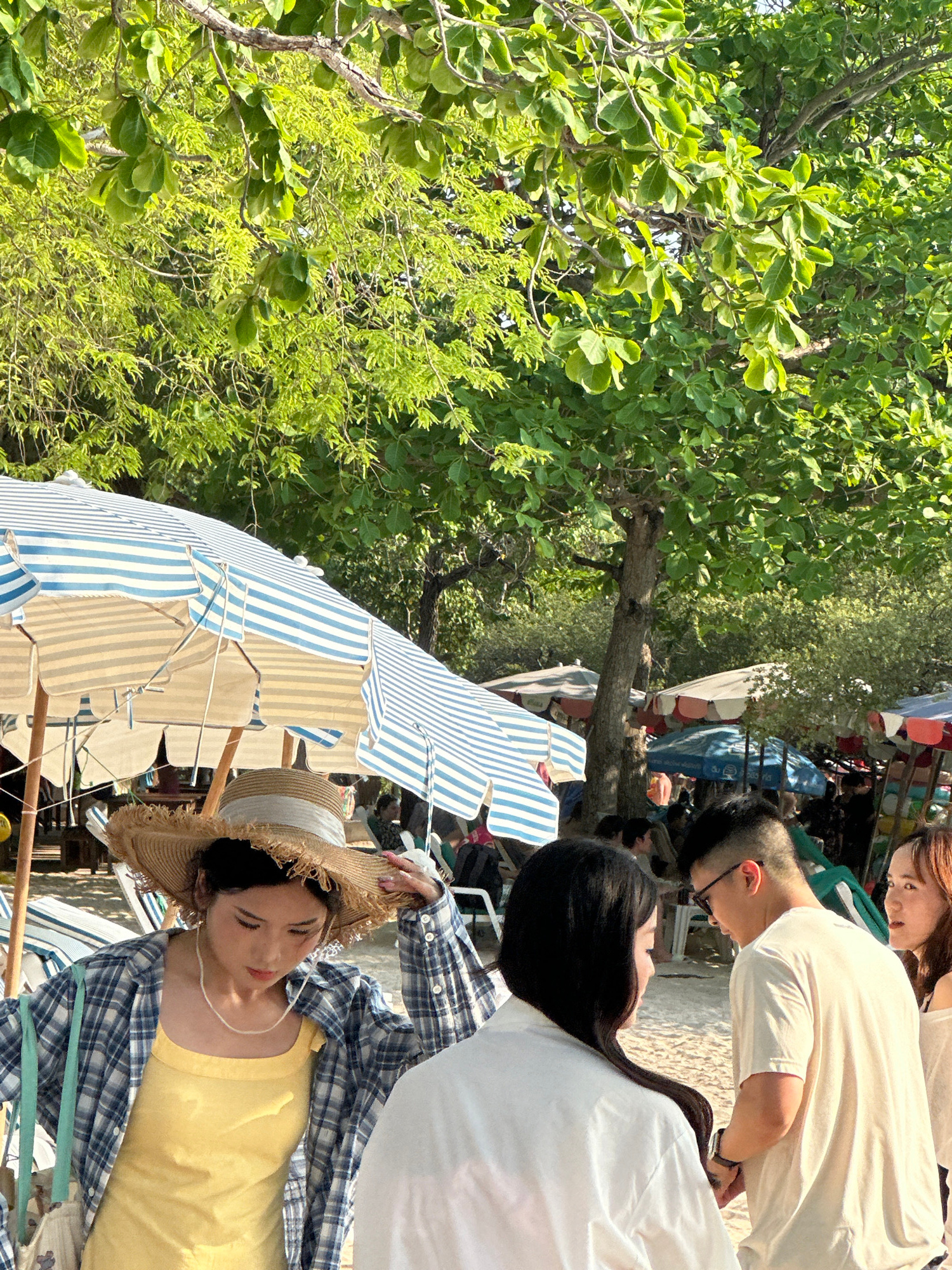 The image captures a scene on a sunny day in Pattaya City, Thailand. The focus is on a young woman wearing a yellow top, a blue and white checkered shirt, and a straw hat. She is seated under a blue a…read more