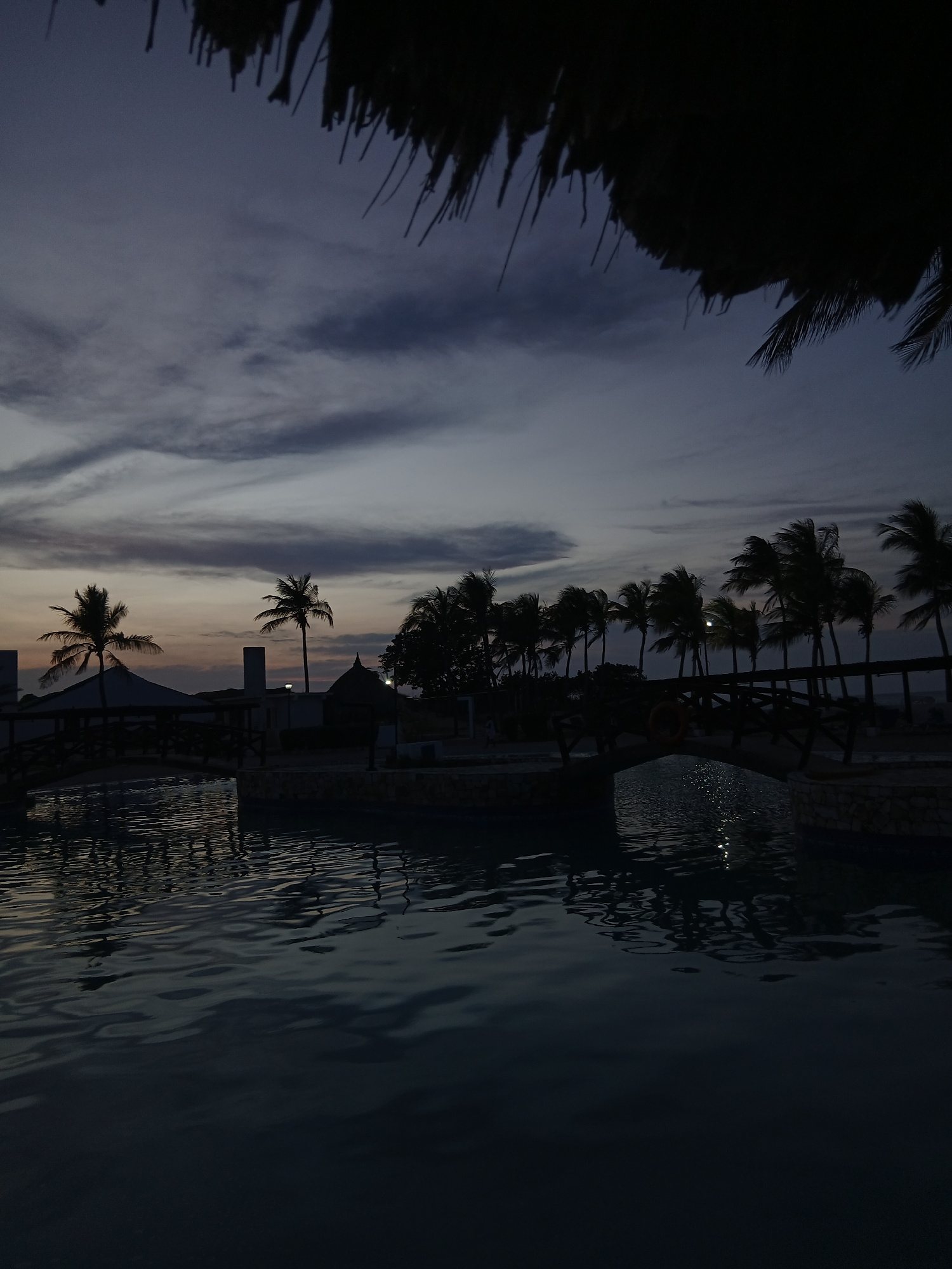 The image depicts a tropical scene at dusk, possibly near a body of water, likely a pool or the ocean, given the presence of waves. The scene is dominated by silhouettes of palm trees against a sky st…read more