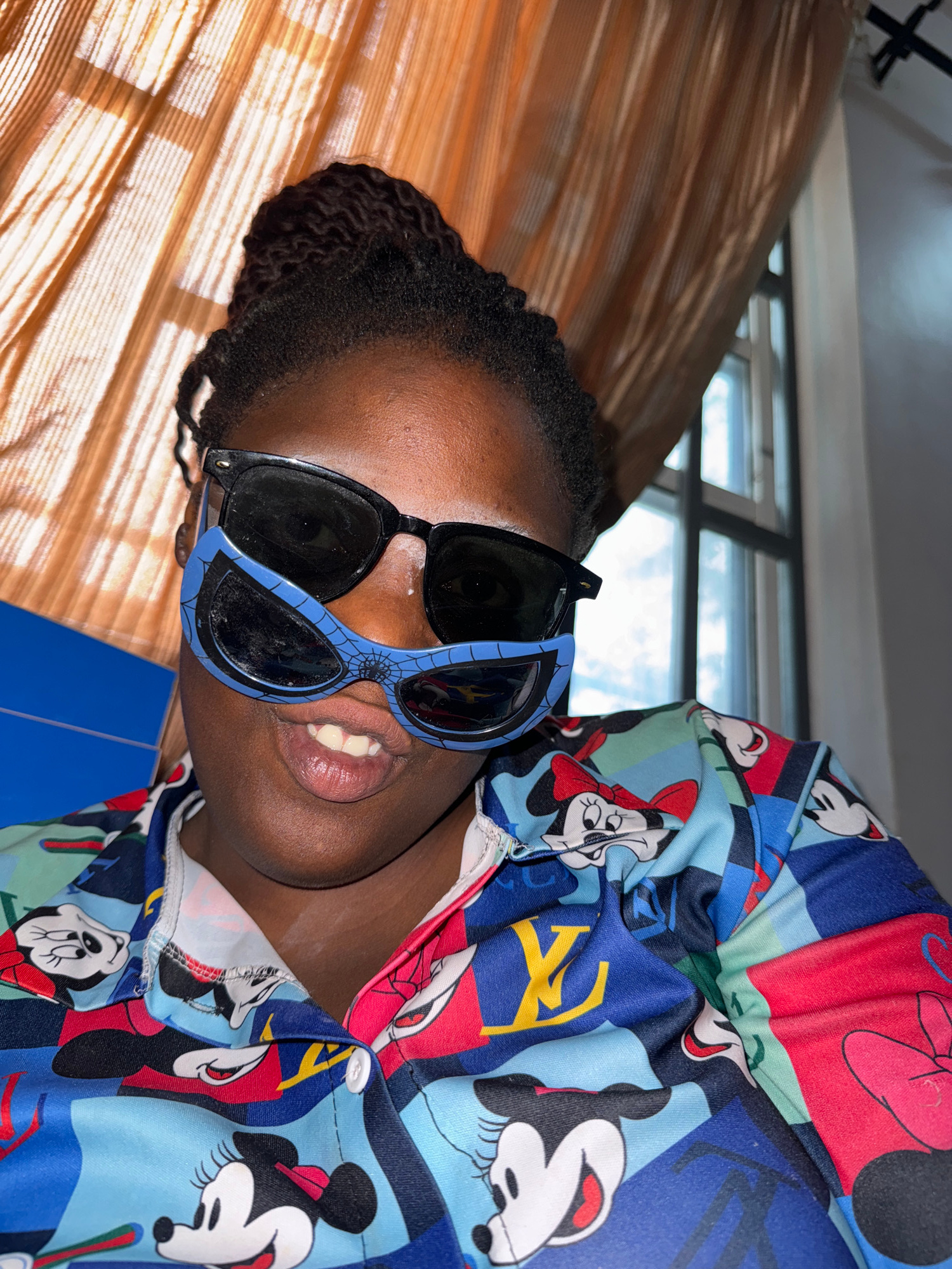 A person with dark skin is wearing two pairs of sunglasses, one black and one blue with a spiderweb design, and a colorful button-down shirt with Mickey Mouse and Minnie Mouse designs. The person is s…read more