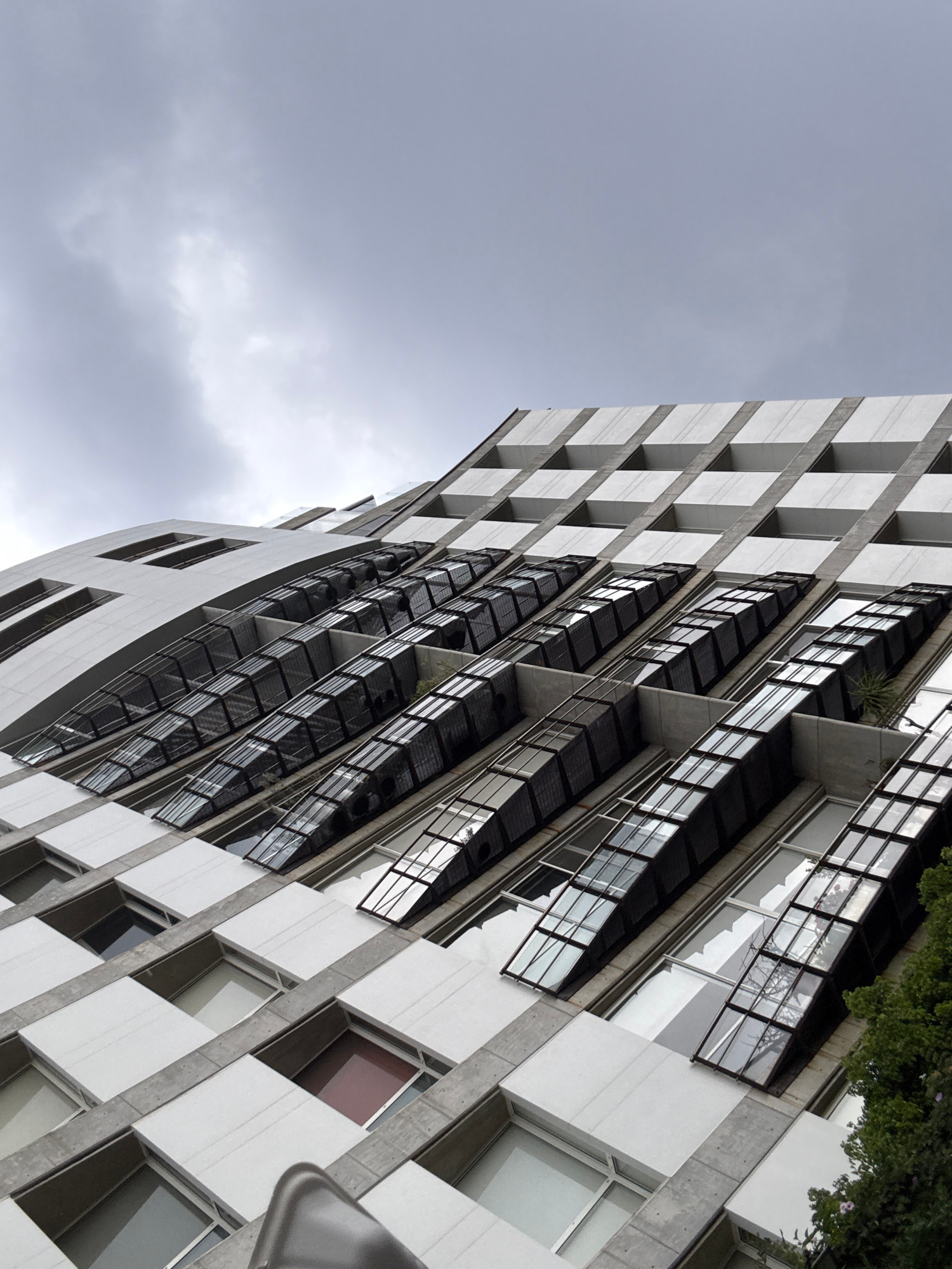 A low-angle, rotated shot captures a modern building in Puebla, Mexico, under a cloudy sky. The building's facade features a grid-like pattern of white blocks and concrete supports. A curved section o…read more