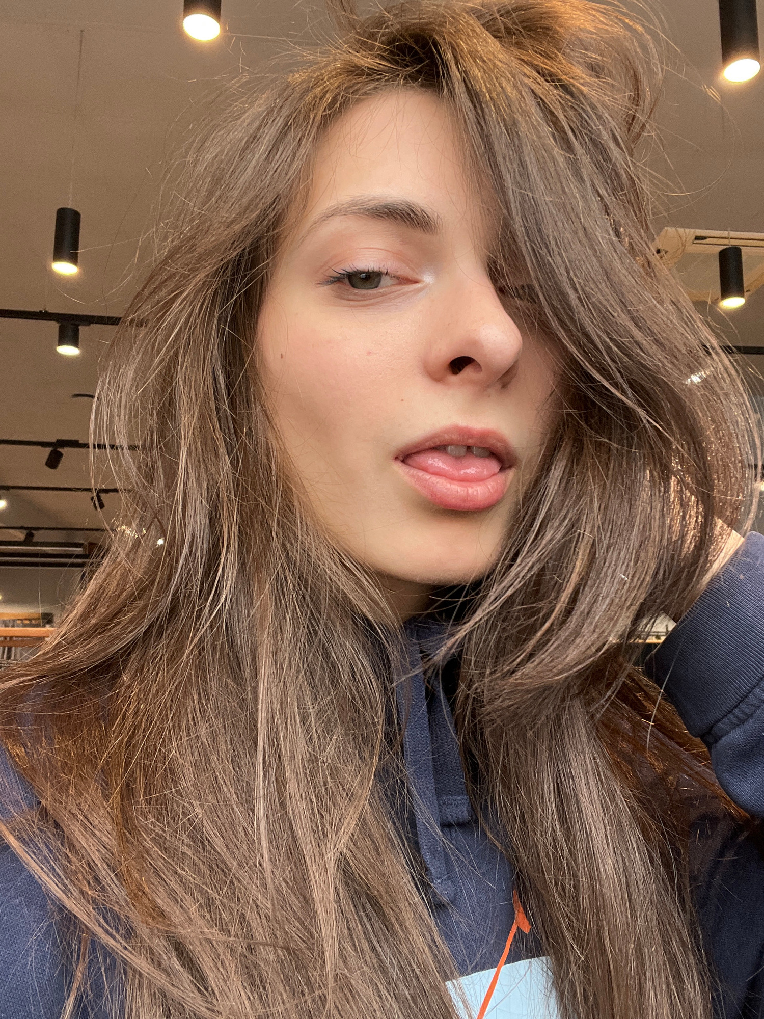 A medium close-up portrait captures a young woman, with the image rotated ninety degrees counter-clockwise. She appears to be lying on her side, looking towards the viewer with a casual and playful ex…read more