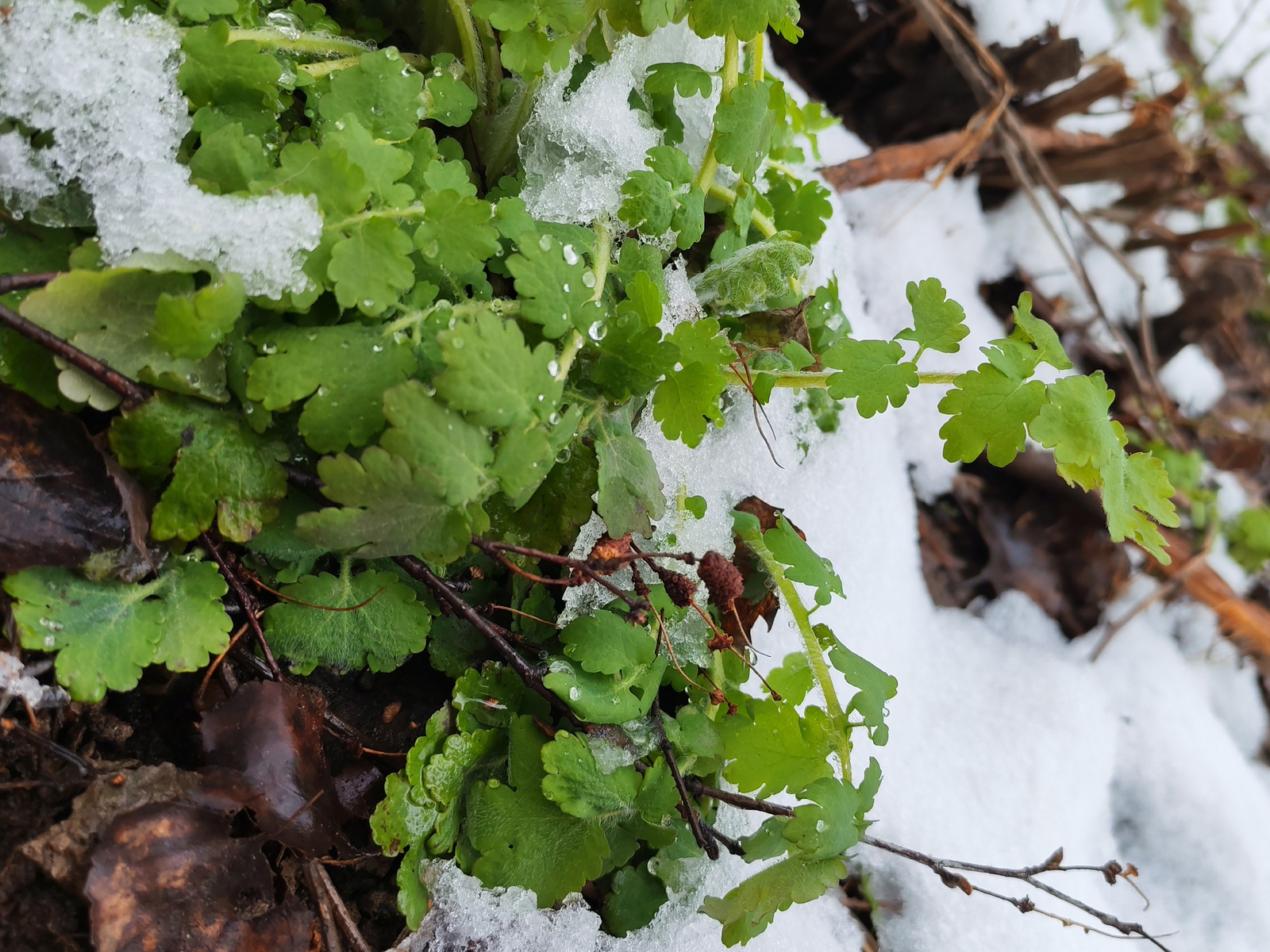 The image shows a patch of green plants covered with melting snow. The plants have small, round leaves with scalloped edges. Water droplets are visible on some of the leaves. There are twigs and falleβ¦read more