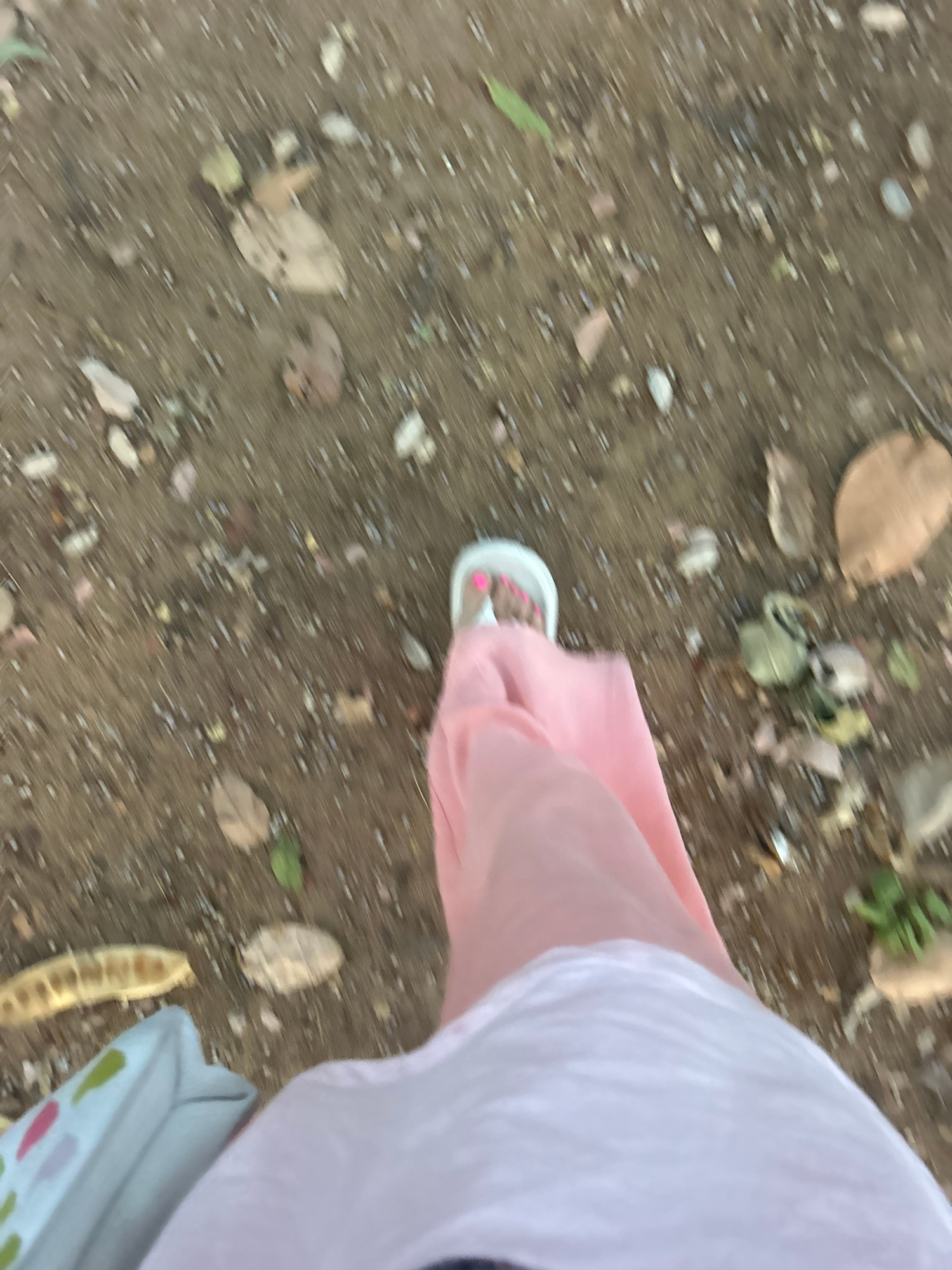 The image shows a ground-level perspective of a person walking on what appears to be a dirt or gravel path. The path is scattered with small stones, leaves, and some plant debris. The person is wearinβ¦read more