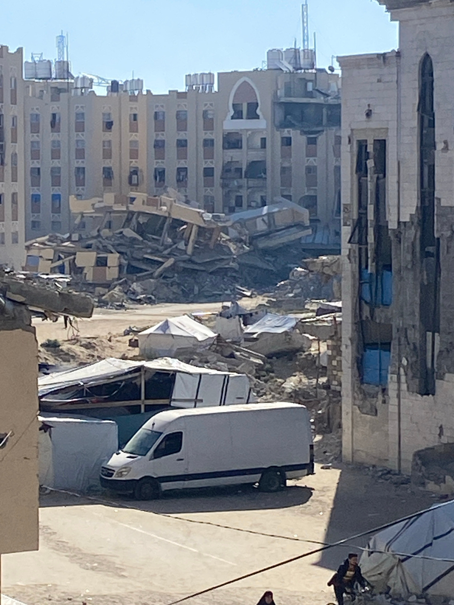 The image depicts a scene in Khan Yunis, Palestinian Territory, revealing extensive destruction of buildings. A tall, partially destroyed building is visible on the left, displaying numerous windows a…read more