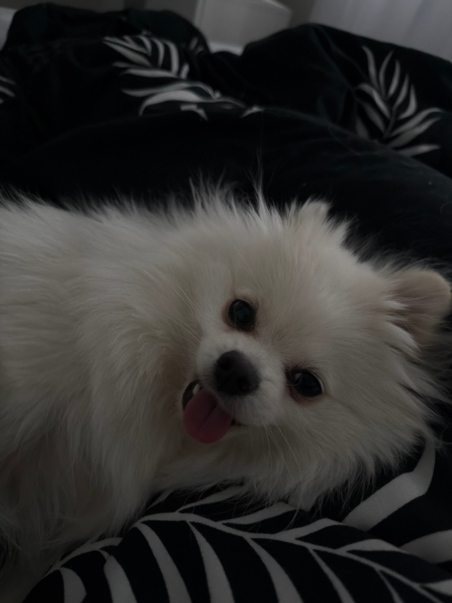 A close-up image depicts a small, white, fluffy dog, likely a Pomeranian, with its tongue sticking out. The dog is positioned against a dark background of patterned fabric, some with a white fern-like…read more
