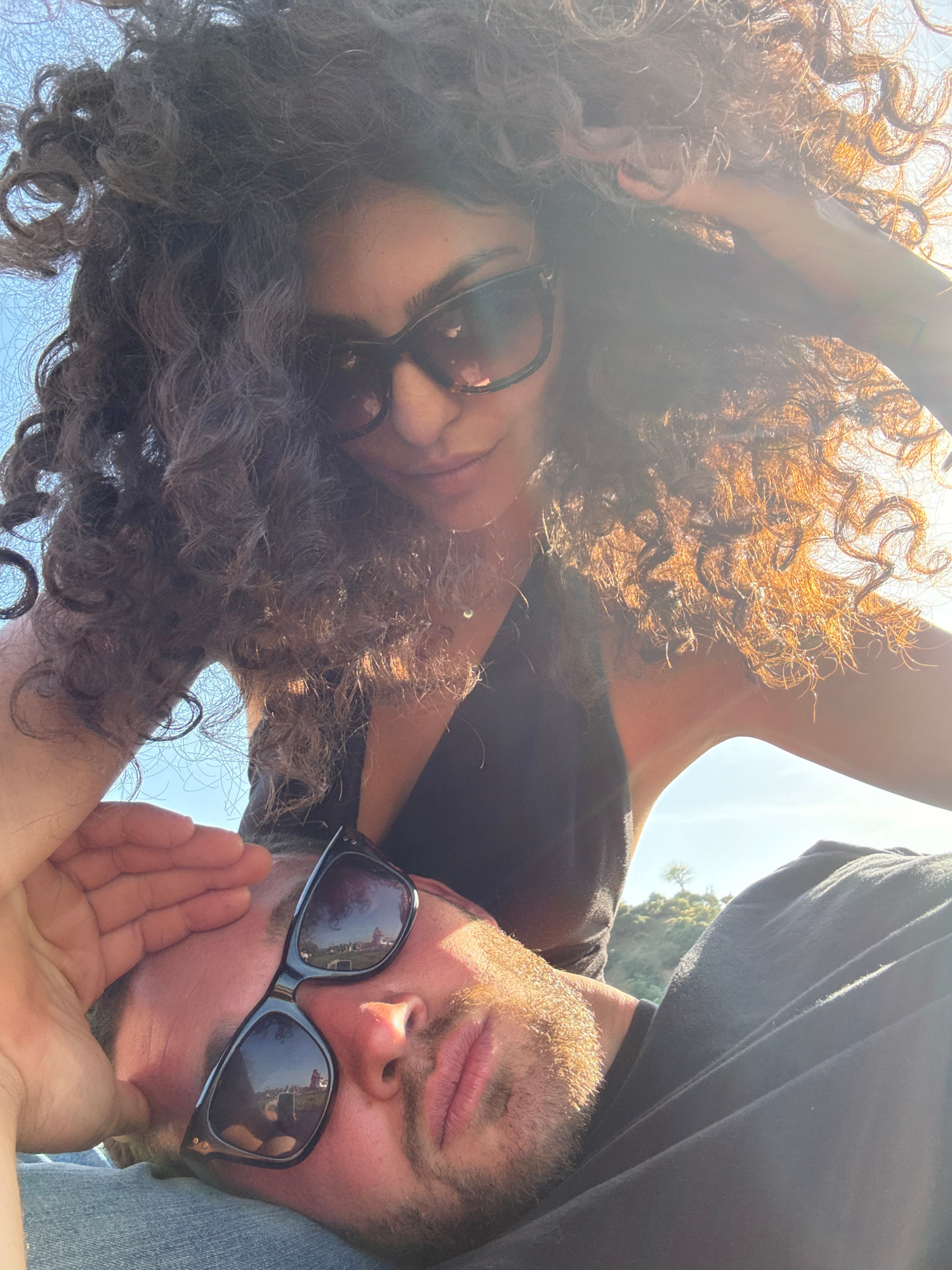 A selfie taken outdoors depicts two individuals. A person with curly brown hair and sunglasses is seen on the left. To their right, another individual, also wearing sunglasses, rests their head on the…read more