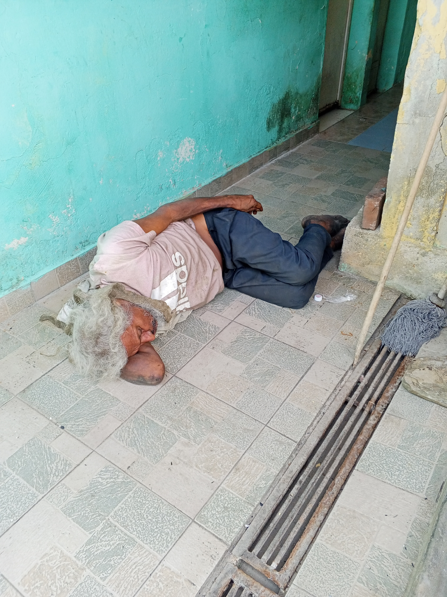A man is lying on a tiled floor next to a turquoise wall and a drain. The man has long, gray hair and is wearing a light pink shirt and dark pants. His head is resting on his arm. A mop leans against…read more