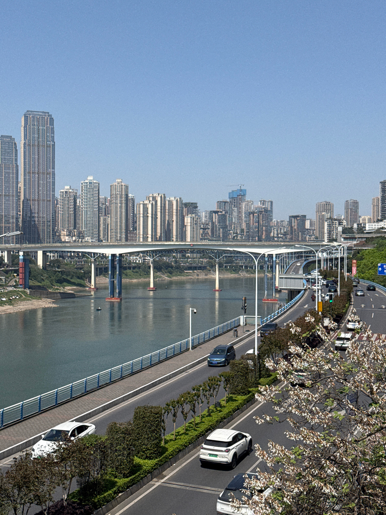The image depicts a section of Yuzhong District in Chongqing, China. The Qiansimen Bridge spans the Jialing River, connecting the district to Jiangbei District. The cityscape is characterized by numer…read more